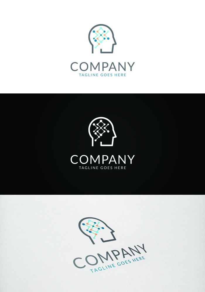 Logo design template featuring a man's profile, with colorful digital neurones as a brain.