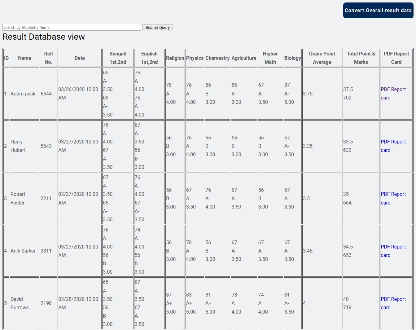 1.Students overall result report card with grade, grade point, total marks with date and time.