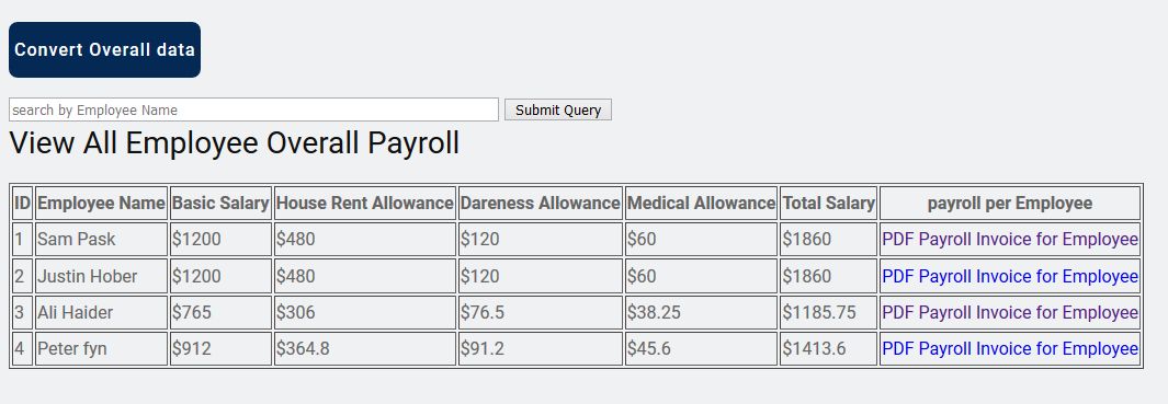 This Script would be perfect for Individual employers, office or any kind of business organizations to find out the employee's overall or individual Payroll calculation with very easily & quickly by one click just putting the employees name and basic salary. This Script can perform employee’s gross salary, HR, DR, TA (You can change or  add other things like tax deduction, incentives, bonus according to your requirements) with date & time. By this, office or organization can maintain their employees overall payroll. In connecting with MYSQL. So, you can record, edit, check and stats your data easily. You can keep the records of the overall Payroll data and every employee’s separate payroll Invoice or certificate with your own logo, banner and other things with PDF format so that you can print & download easily. All thing will be done just by a click on calculate and save Payroll button.