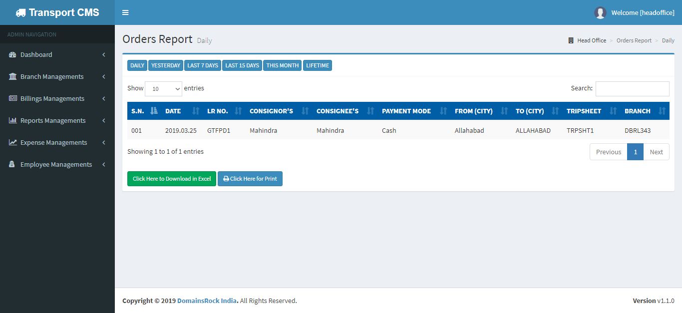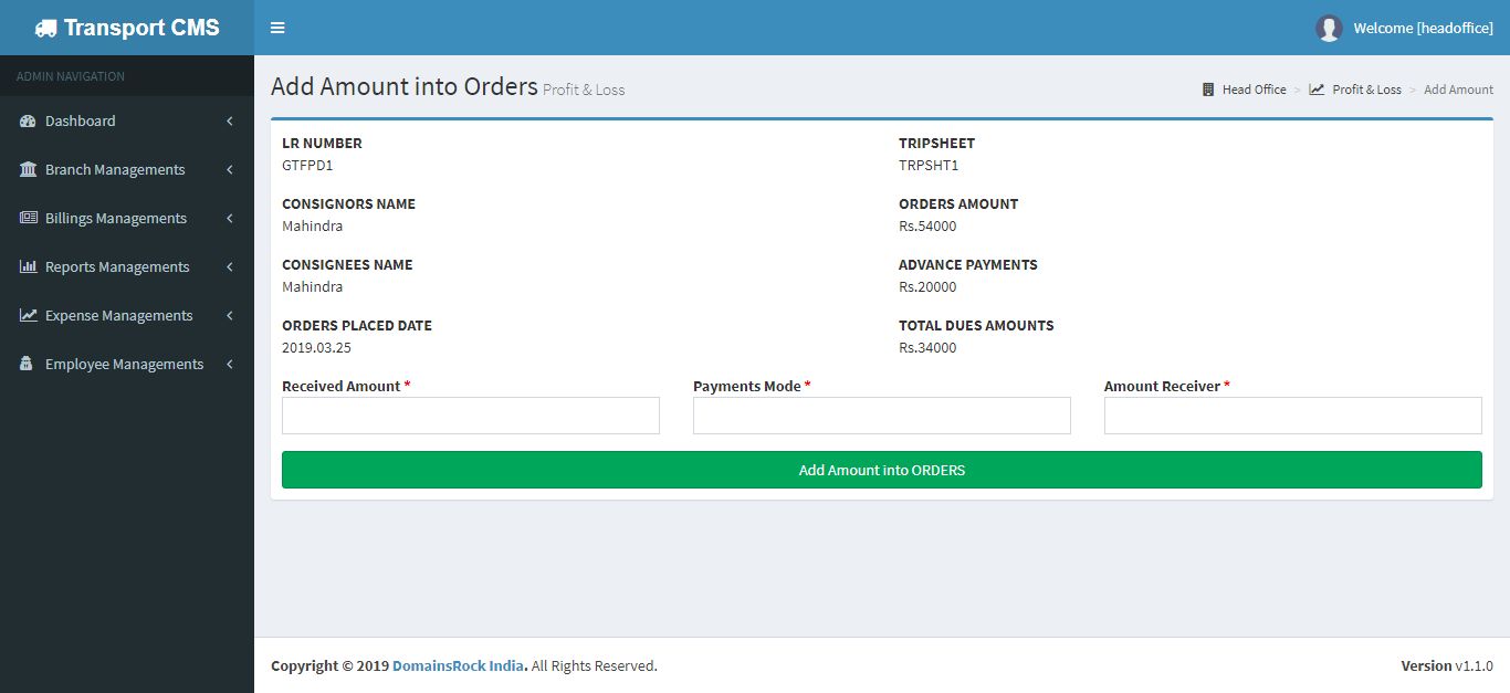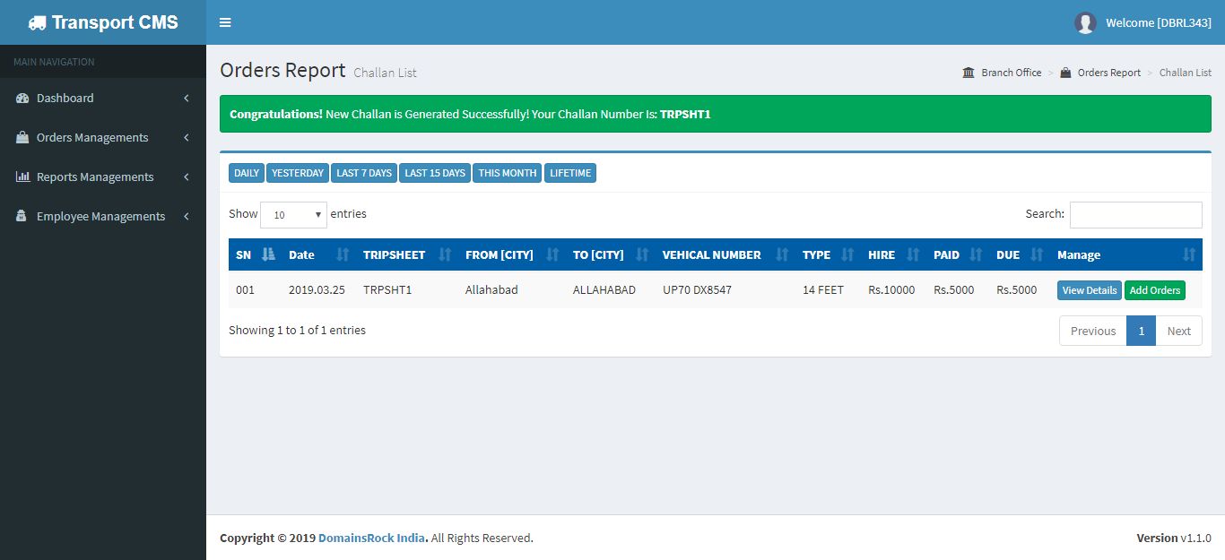 A Software to Manage and Controls the Transport System. Easily Add Orders and Manage Orders Reports with Profit and Loss Using Daily/Weekly/Monthly. Download Excel File and Easily Prints All Orders and Reports. Expense Book and Expense Passbook to Manage Expenses for Head Office and Branch Office. Employee Managements with Attendance, Leave Application Form, Feedback and Etc.