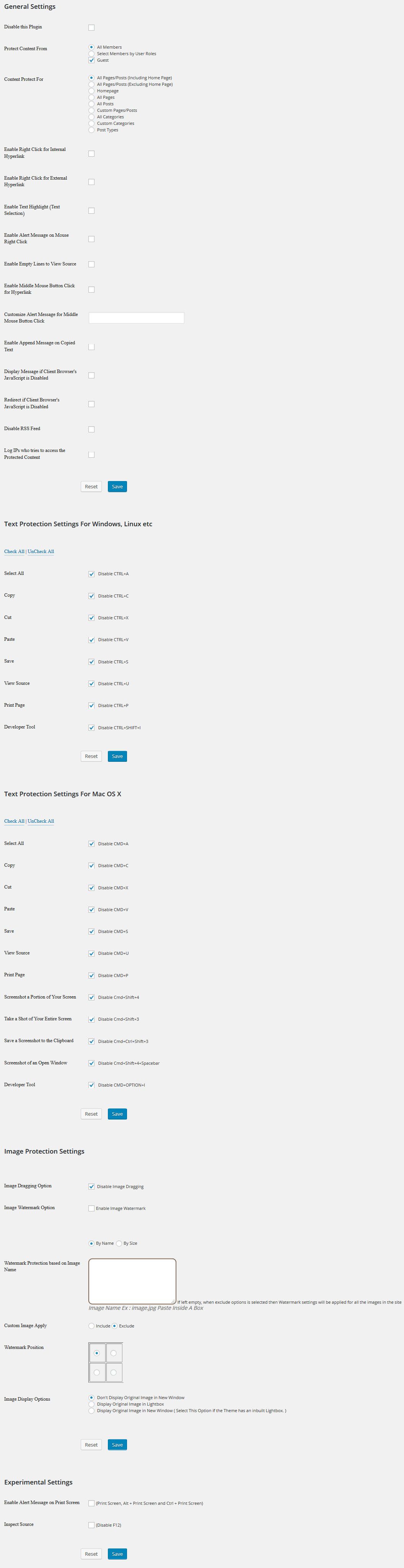 - Different Types of Settings like General Settings, Text Protection Settings, Image Protection Settings for customizing the Plugin as per your needs
