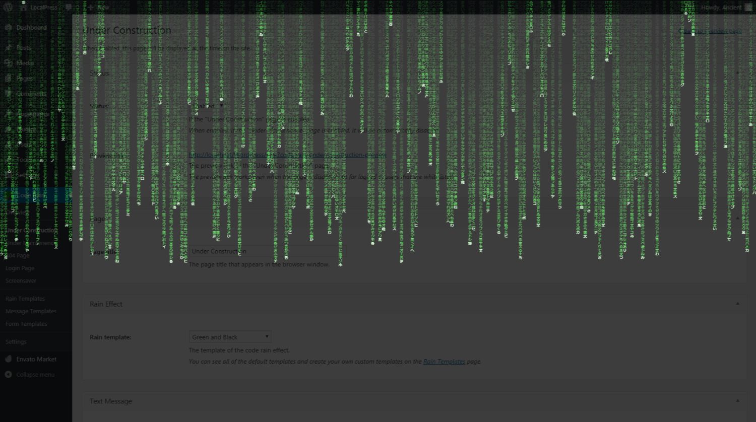 Create custom pages for WordPress: Under Construction, Under Maintenance, 404 Page, Login Page, Admin ScreensaverCode Rain - Custom pages for WordPress