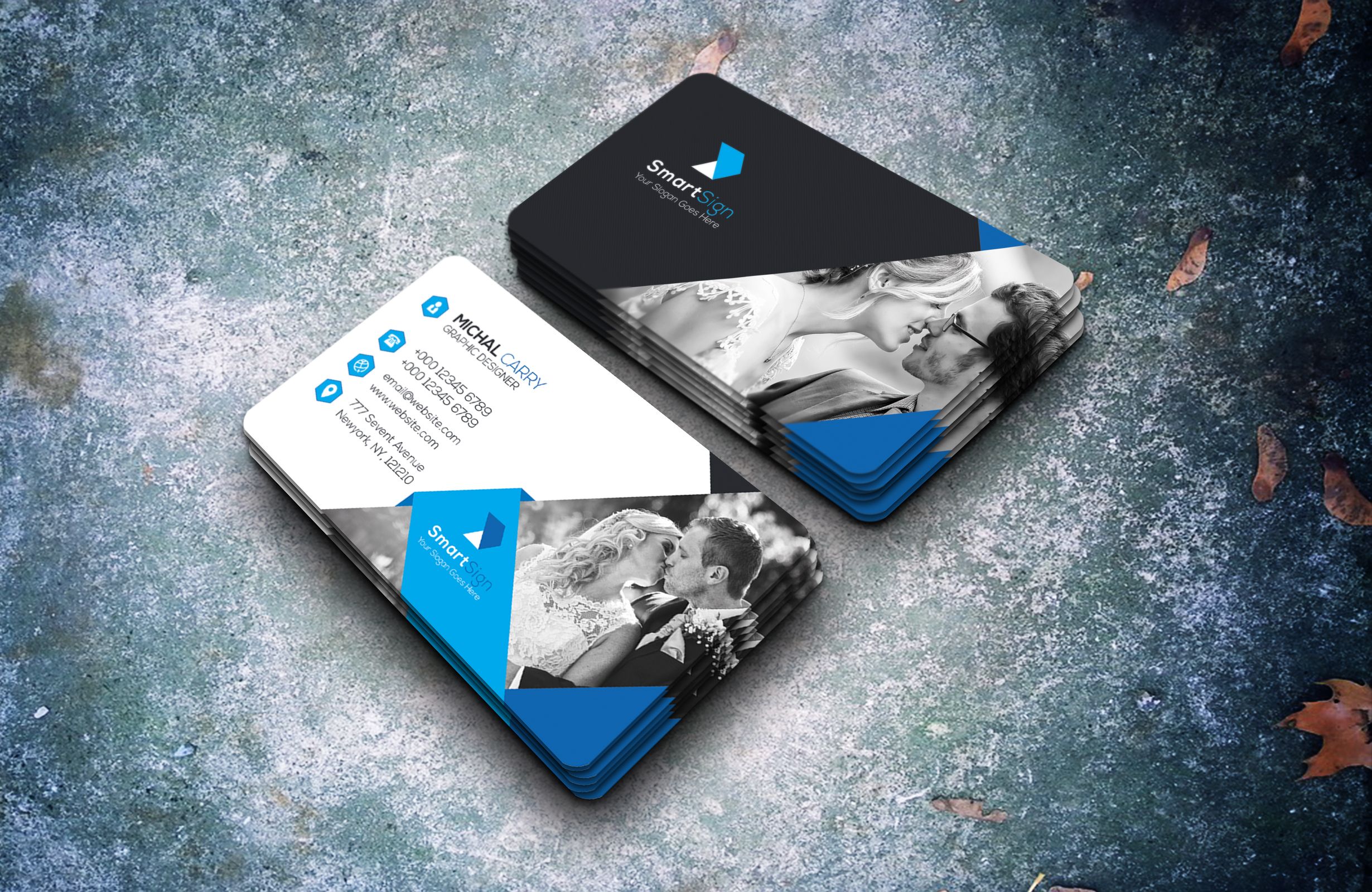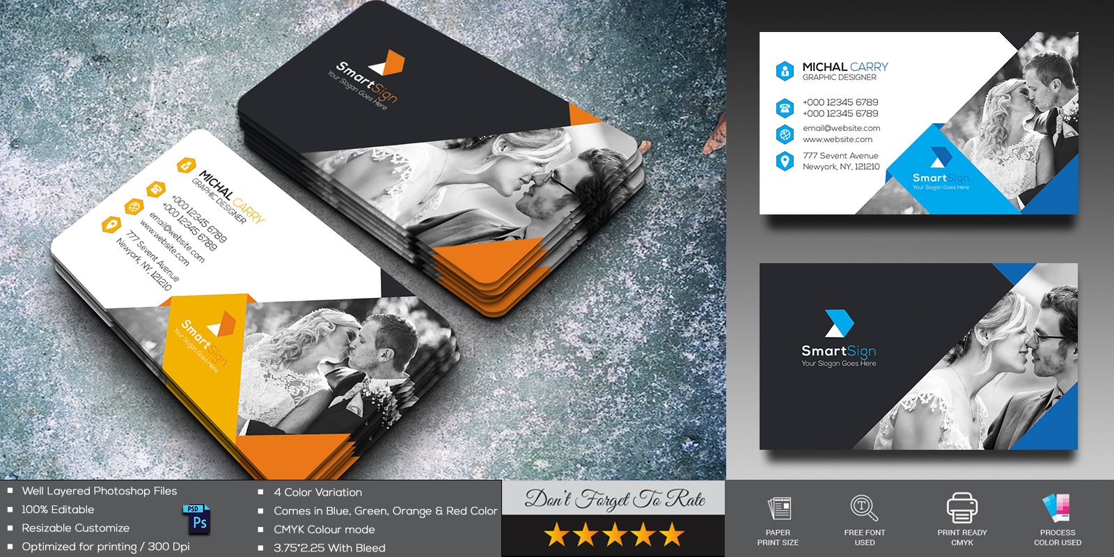 Business Card comes with 4 Variation normal colored background, However unlimited color variations can be made by using the Color Fill option bar included for each layer