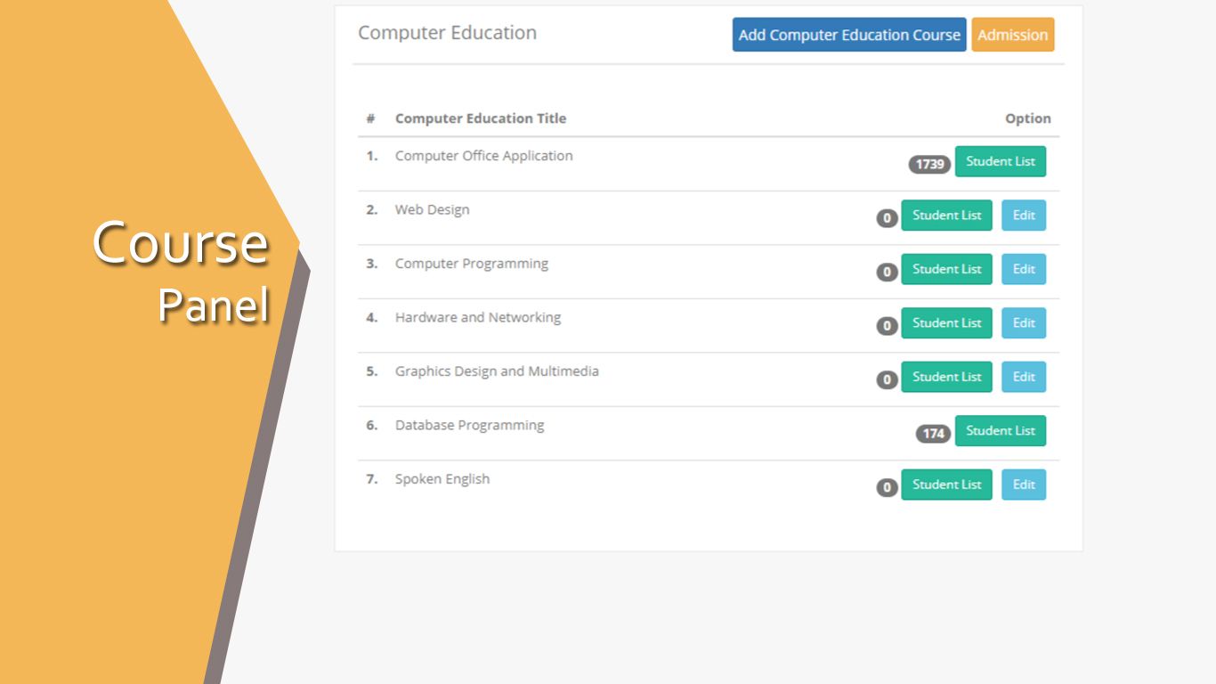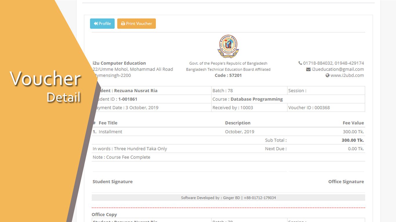 Training Center Management (Administrative) is web solution for manage admission, course, packages and payments with voucher printing. This system also manage student profile, voucher archive, due and balance. You can find a complete day end or date range ledger which will help you most in your business accountability.