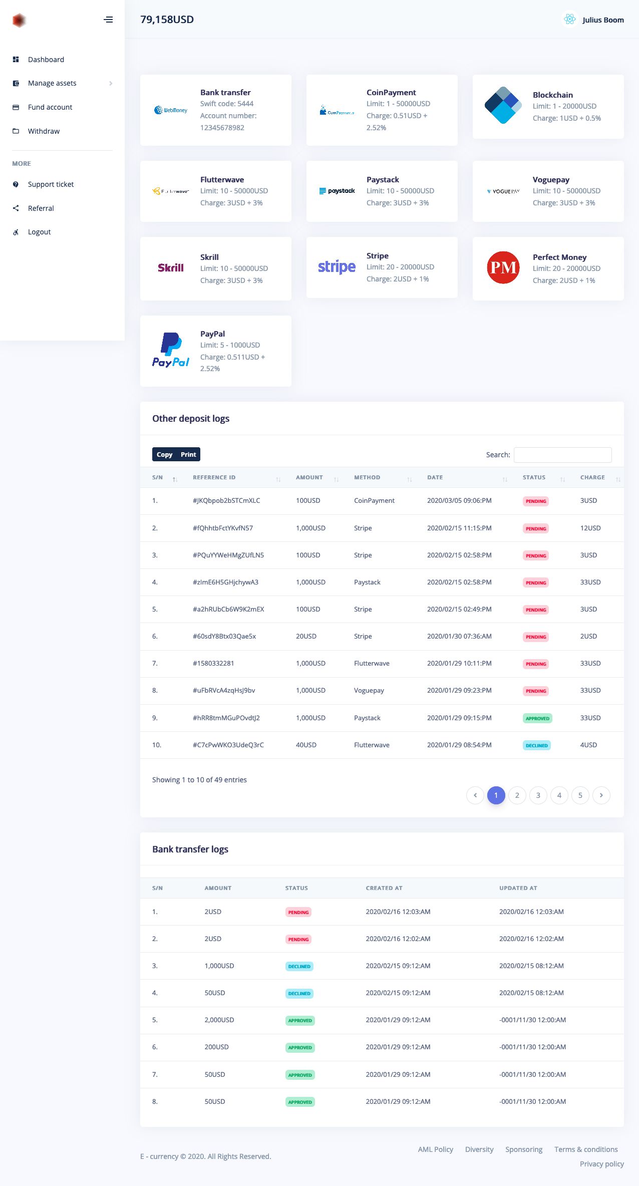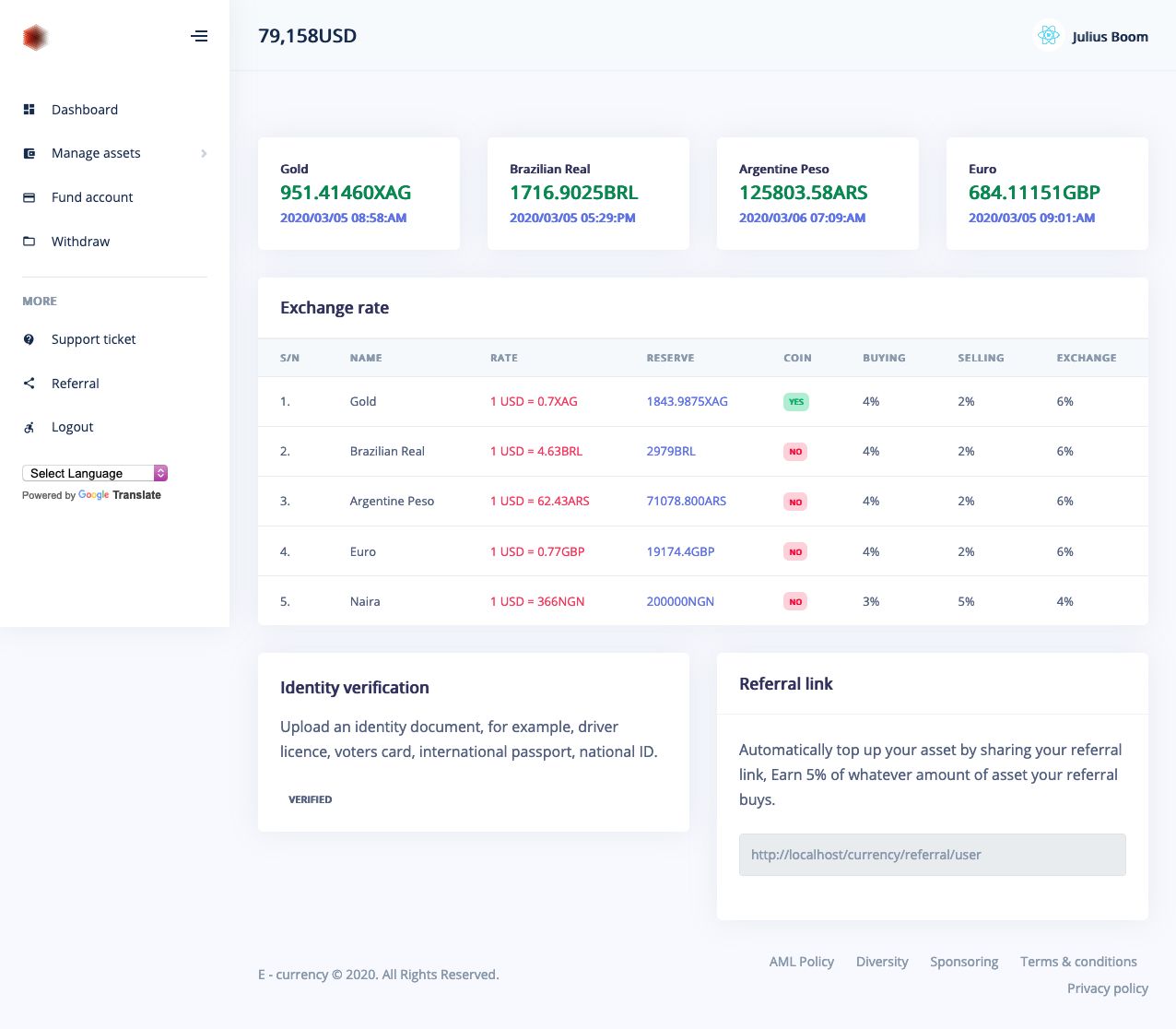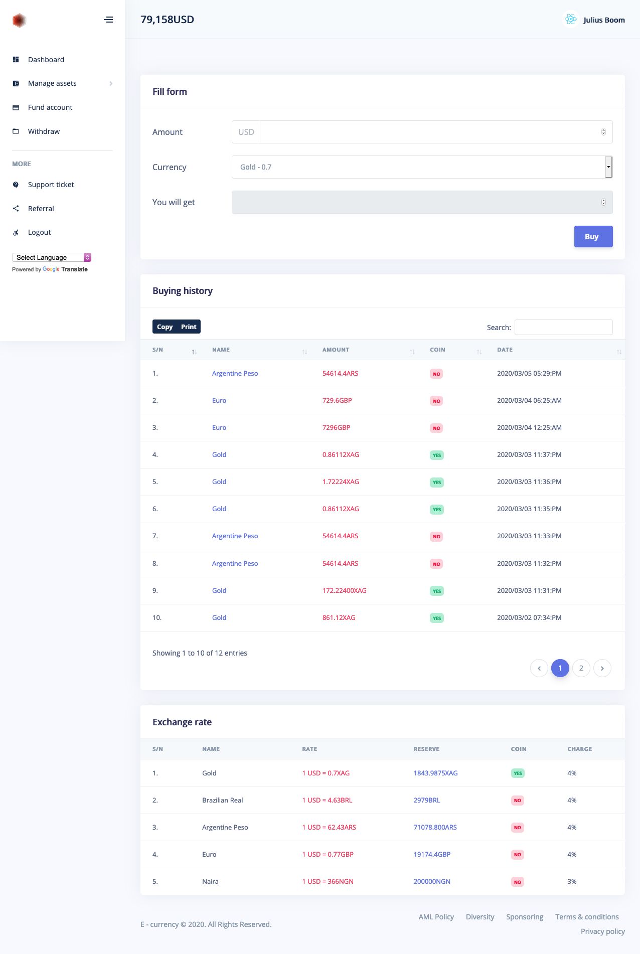 E-currency is a platform for selling, buying and exchange of any currency. It comes with the best framework(laravel) for optimized and improved security. Its built to be beautiful, fast, secure and powerful. its easy to install our system within 5 minutes without any technical knowledge.