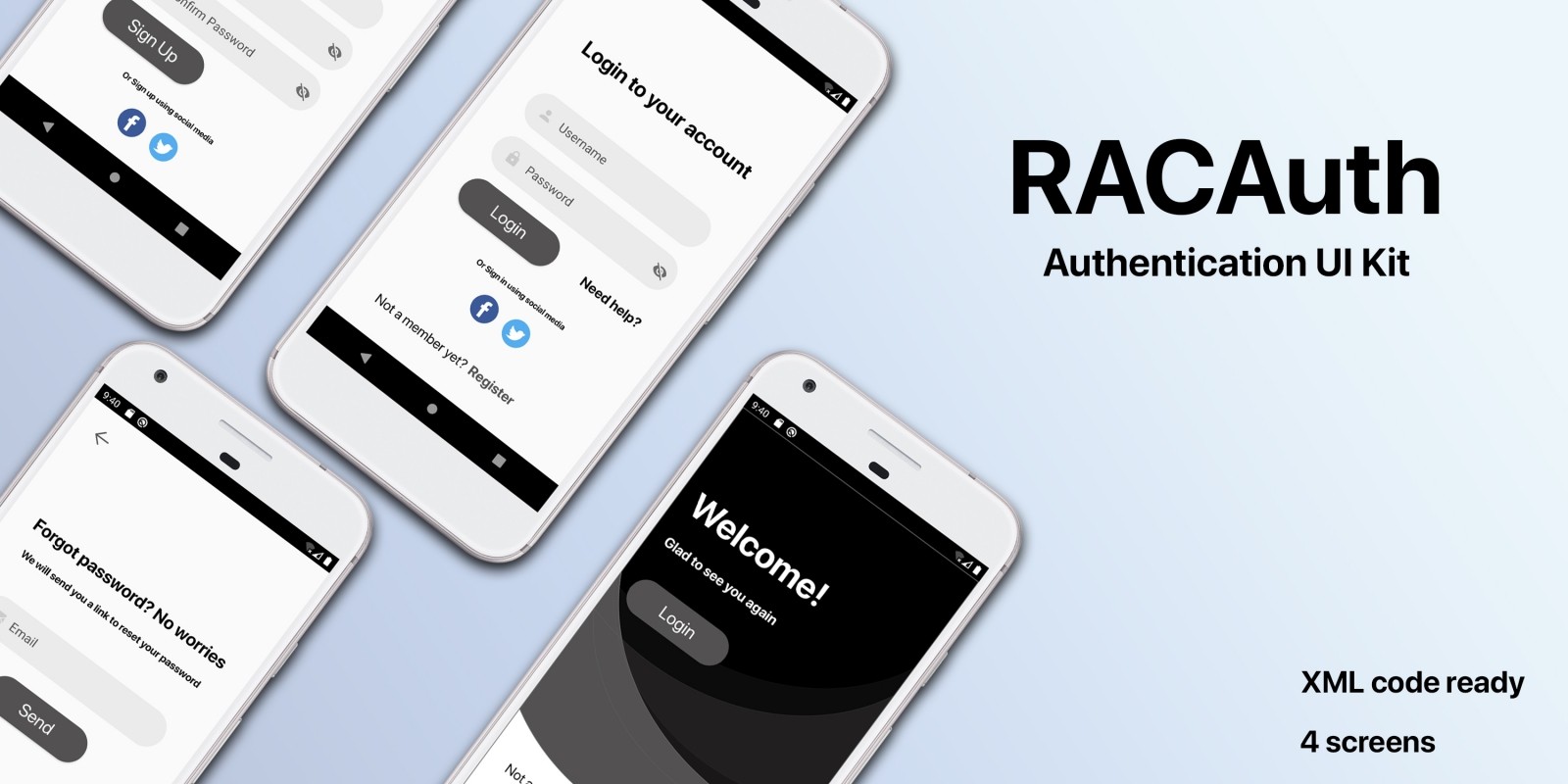 RACAuth is an authentication UI Kit which helps you save a lot of time by focusing on important tasks while developing your android app. You can easily change text, colors and graphics or place photos. This authentication template contains 4 screens: Welcome, Login, Register and Forgot Password.