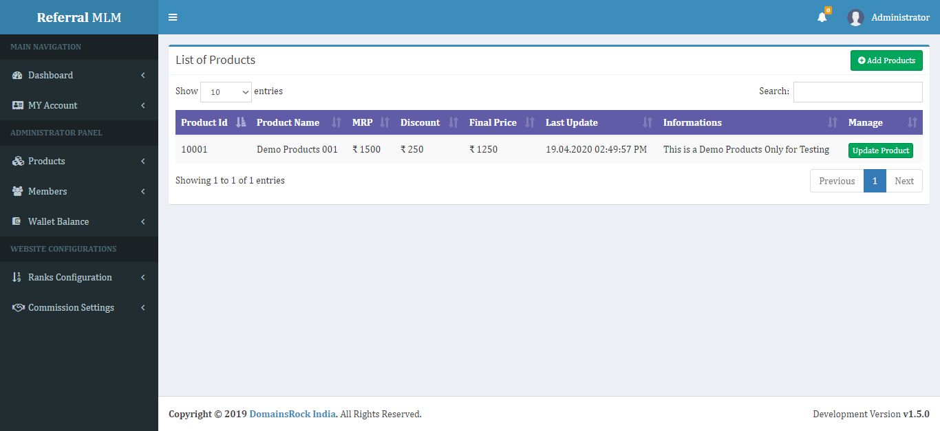 There are Only Login Functions for Administrators and Members and There are Registration Form Under Administrator Panel. Administrator need to Add New Members by Using Any Registered Members Id. This System is Based on Product Plan, So Administrator need to Create A Product First and need to Update the Commission Distribution Percentages of Product Amount from Admin Panel. There are 12 Level of Commission Distribution between Referrals and Upline Referrals Upto 12 Levels. So Admin Need to Calculate the Profits and Share Amount of Product Price and Update Commission Charts.