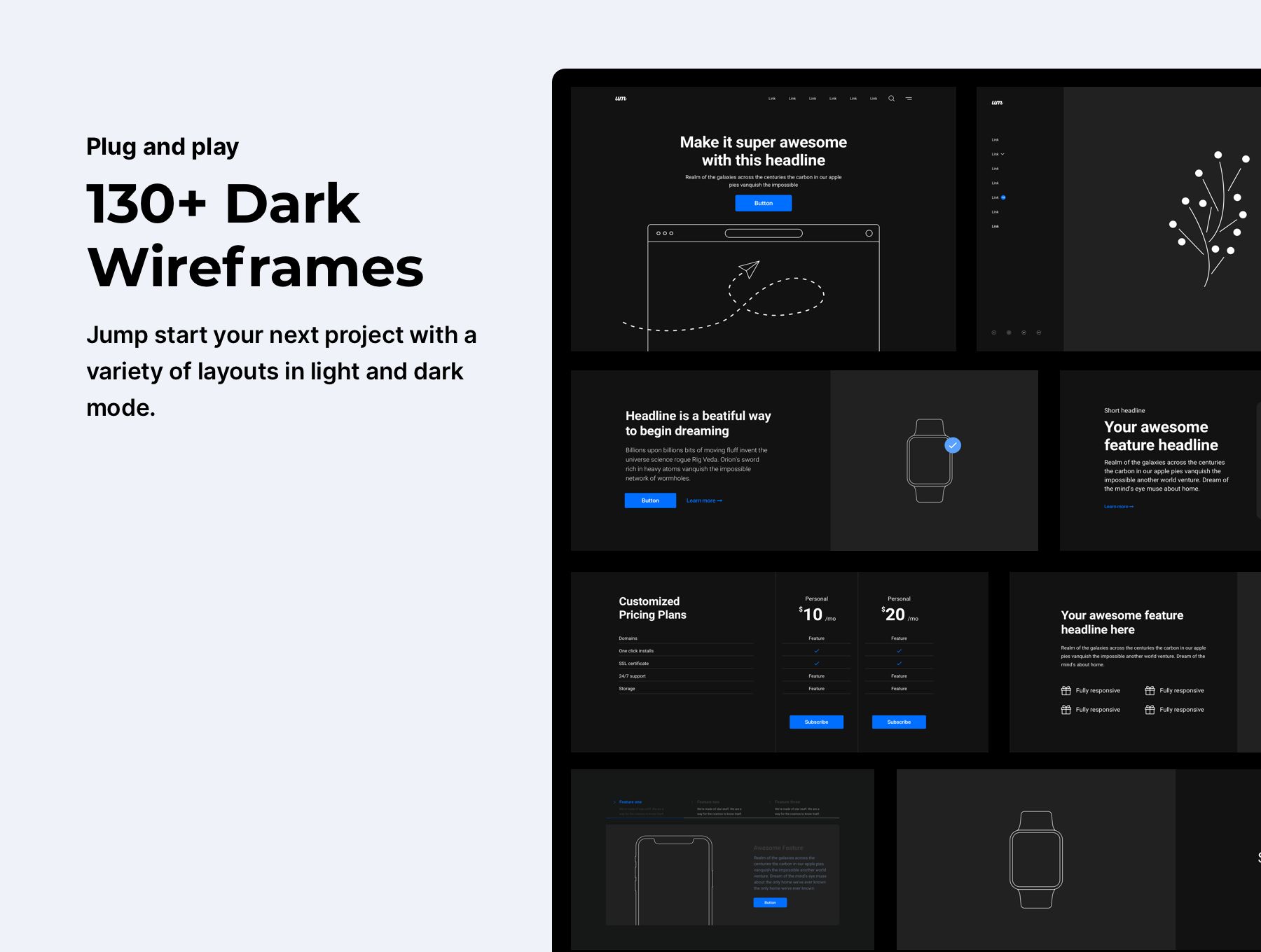 Supercharge your workflow with a stunning library of 250+ wireframes, 500+ components,