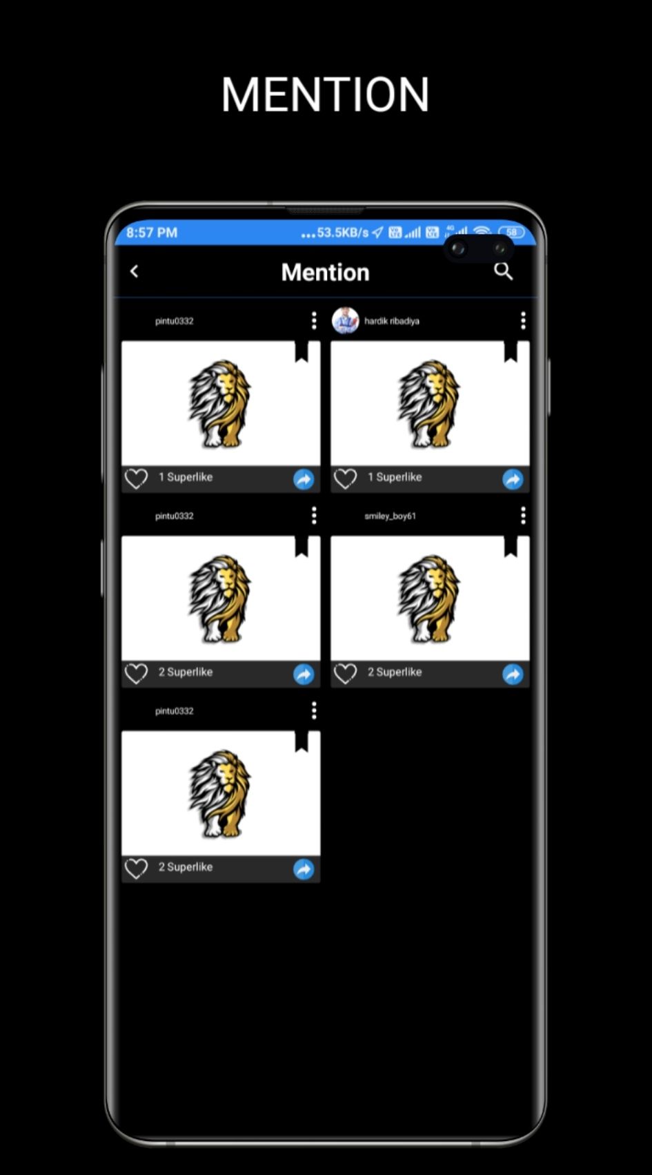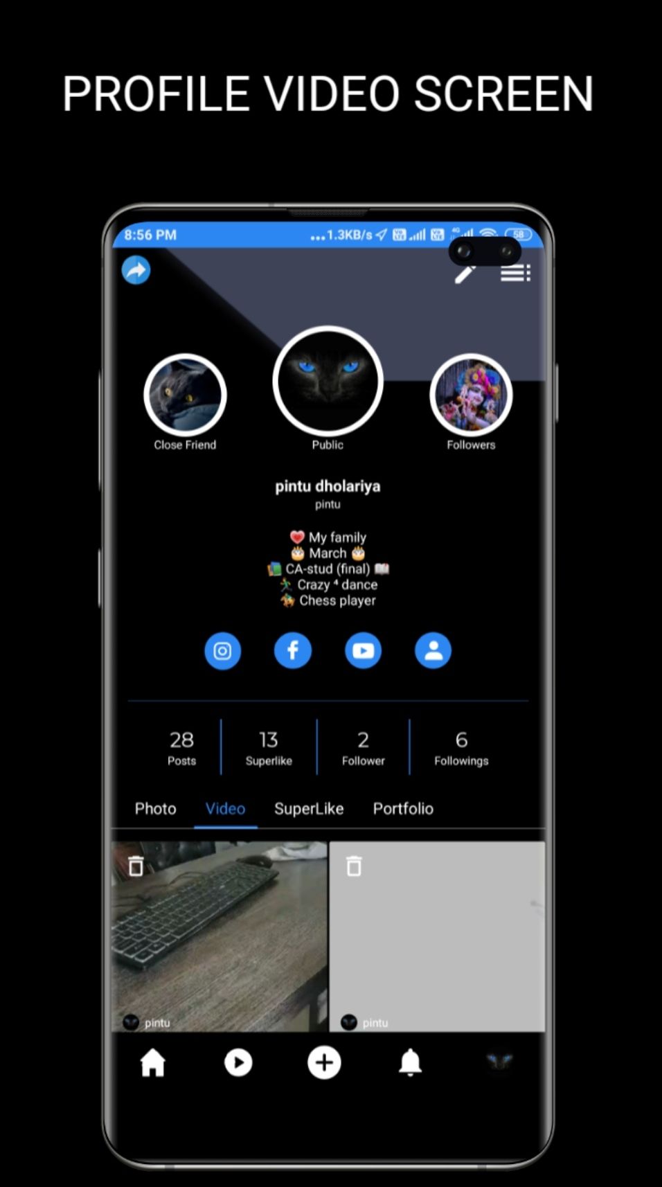 - In this photos and videos profile, user can like, superlike and commenting on their    videos and photos