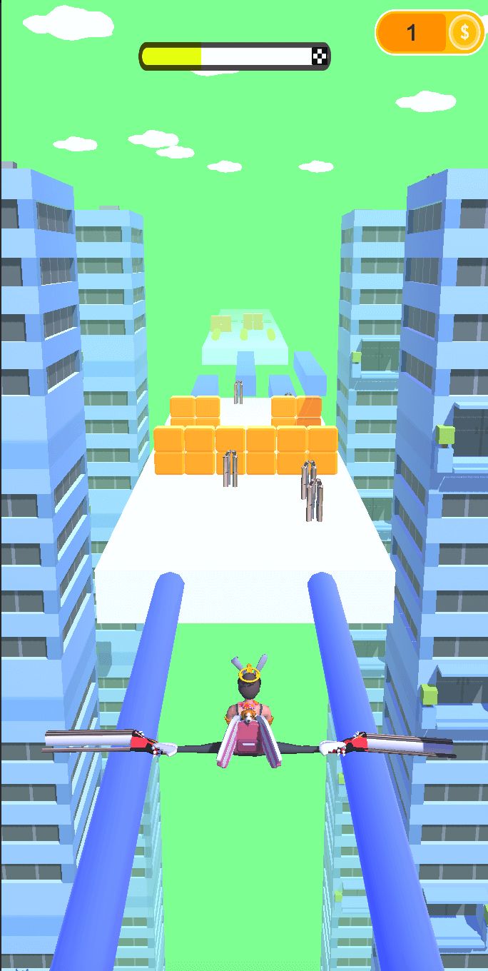 Different obstacles await you at each level! There are rails where you have to spread your legs and slide.