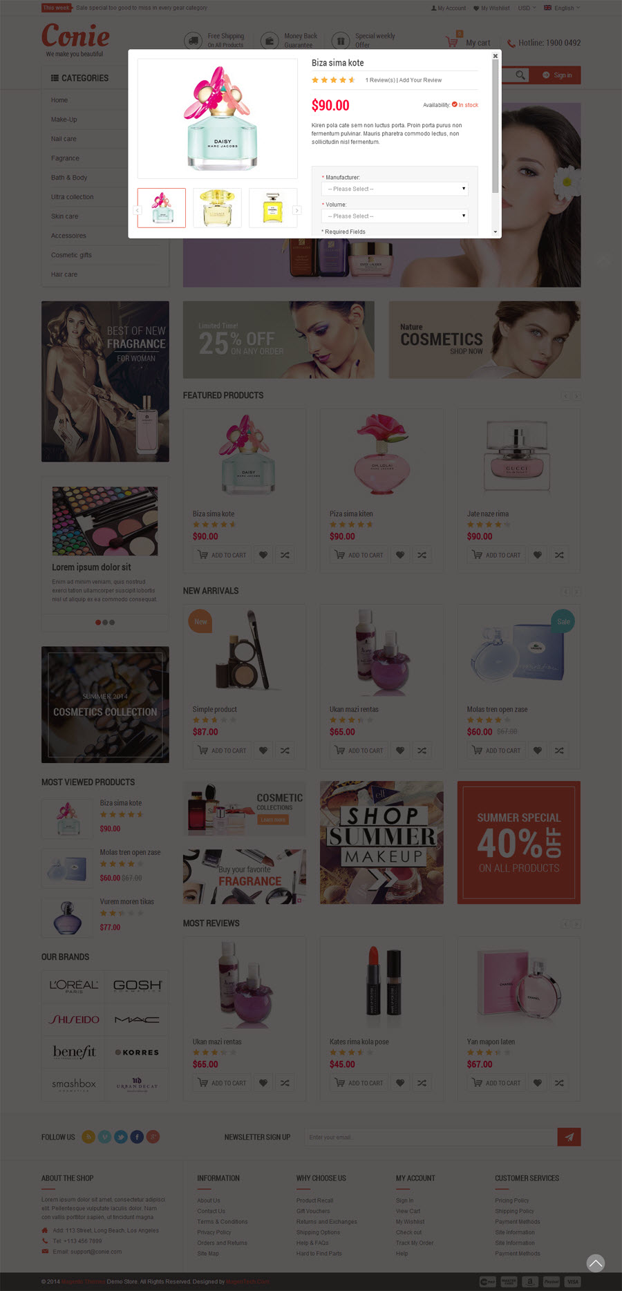 SM Conie - An elegant cosmetic Magento theme with fully responsive layout which will perfectly fit for cosmetic, fashion, and fragrance stores... Built with fully responsive layout that looks great on mobile and all tablet devices. If the product image is large, this layout will automatically adjust thumbnail size to fit all screens.