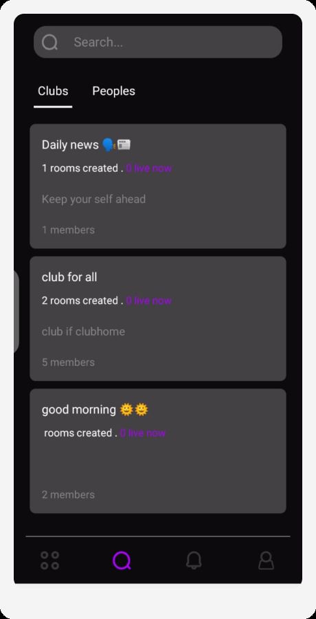 - Clubs can be seen with its title, short description, total members , total room created and live rooms.