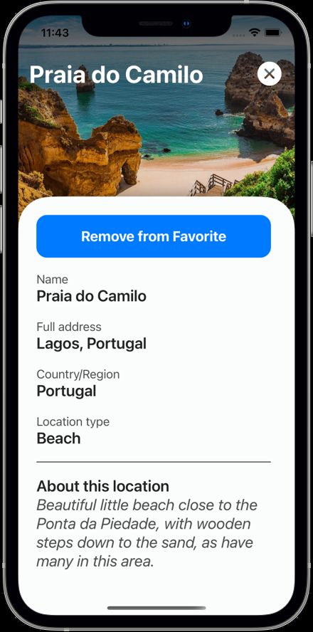 -Â Tapping a travel destination, a full screen will be presented with more details about the location. The user can add/remove this location to the favorites list
