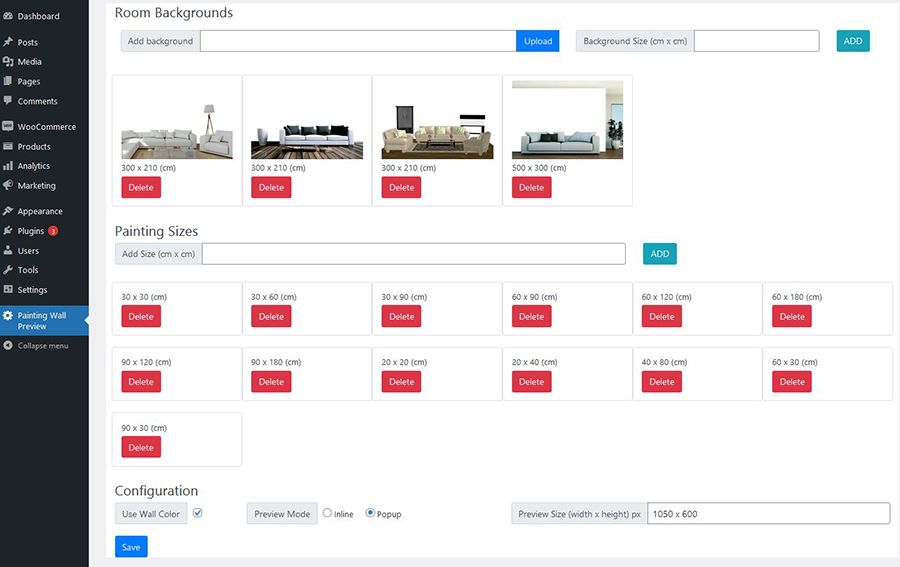 Artwork - Painting Wall Preview for WooCommerce allows customers to preview artworks products in different rooms, with different wall colors, it has two display modes, it makes the site depict the painting on a wall relative to other objects so the customer can see approximately what it looks like relatively in a room.