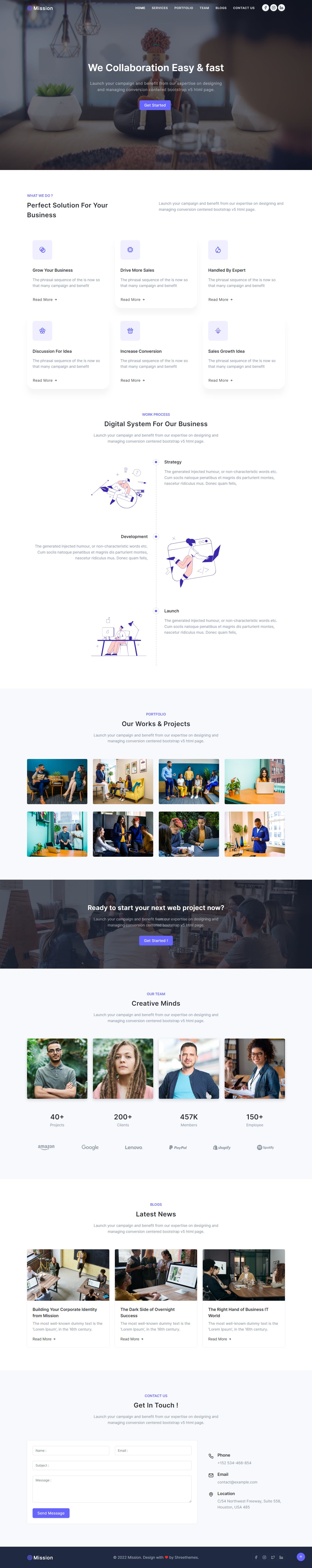 Mission is a fully responsive, clean, and modern high-converting landing page template. It is a beautifully handcrafted, pixel-perfect HTML5 landing page template based on the latest Twitter Bootstrap v5.1.3. Mission comes with 6 home demos Html files. All files are organized we believe it will be easy to use and edit them. This template is well organized and very easy to customize. Quick and easy to set up.