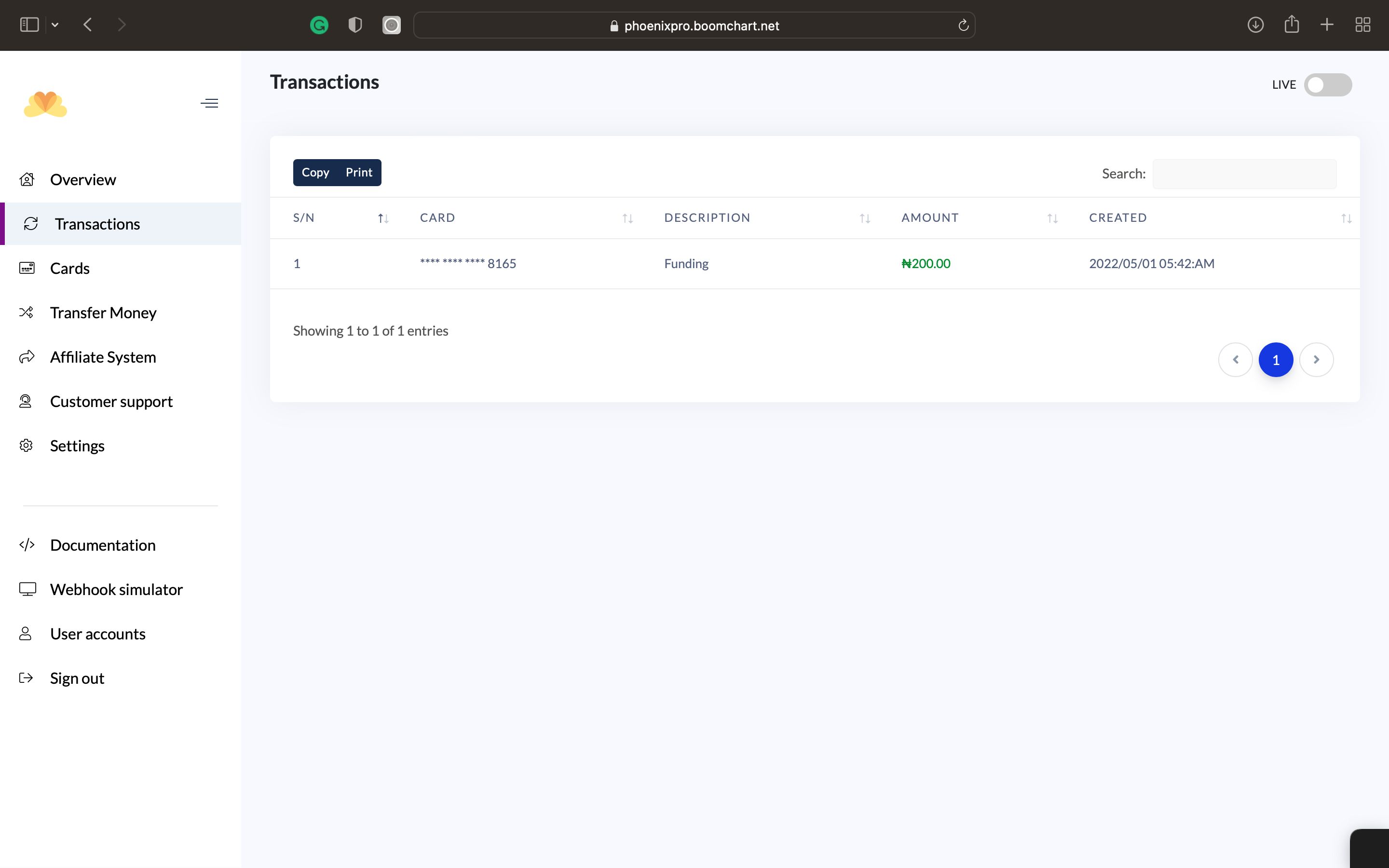 Phoenix is a virtual card reselling software aimed at those that want a platform to sell and resell virtual cards through API. It supports only NGN or USD as supported currencies. Flutterwave API was used, so it's very simple to set up in less than 5 minutes. It comes with documentation for instructions on how a developer can integrate your virtual card API to their own software and resell. We added a simulator to ensure developers can test for OTP and transaction charges webhook. It has an affiliate system for marketing purposes. A reward system that rewards affiliates with money when referrals buy a virtual card the first time. The system was rebuilt from the ground up with card details, Flutterwave API keys encrypted for security purposes, and to keep the system PCI complaint. Phoenix supports mobile app development but if you need access to the postman workspace or want us to help you build an app using flutter, you can contact us. Phoenix has been redesigned for better UX, improved for virtual card reselling, and will enable start your virtual card reselling business in no time.