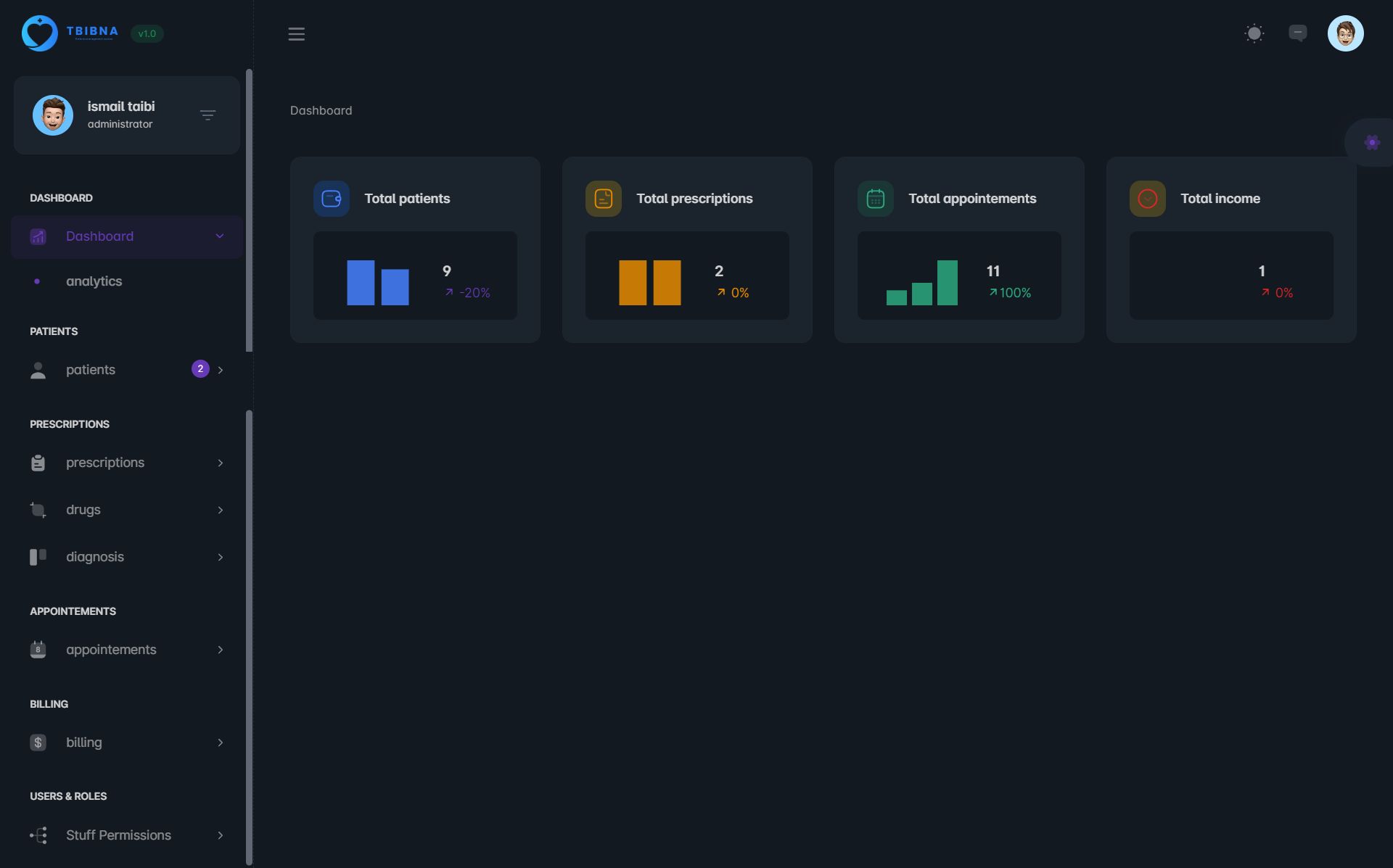 TBIBNAÂ is a responsive patient management system. It is complete solution for doctor to manage their patient appointments, patient details and also manage billing of particular patient. This system is built completely with PHP Laravel 10Â framework and MYSQL. It has a nice and attractive interface that are really awesome and eyecatching. The system has a lot of nice features that are needed for a doctor to handle their patients easily.This system is bulit using PHP Laravel 10 framework. For this reason, it can be customized easily by most of the developers. In all pages, all security checks and invalid page submission checking were done so invalid user cannot access your system and your data will be safe.