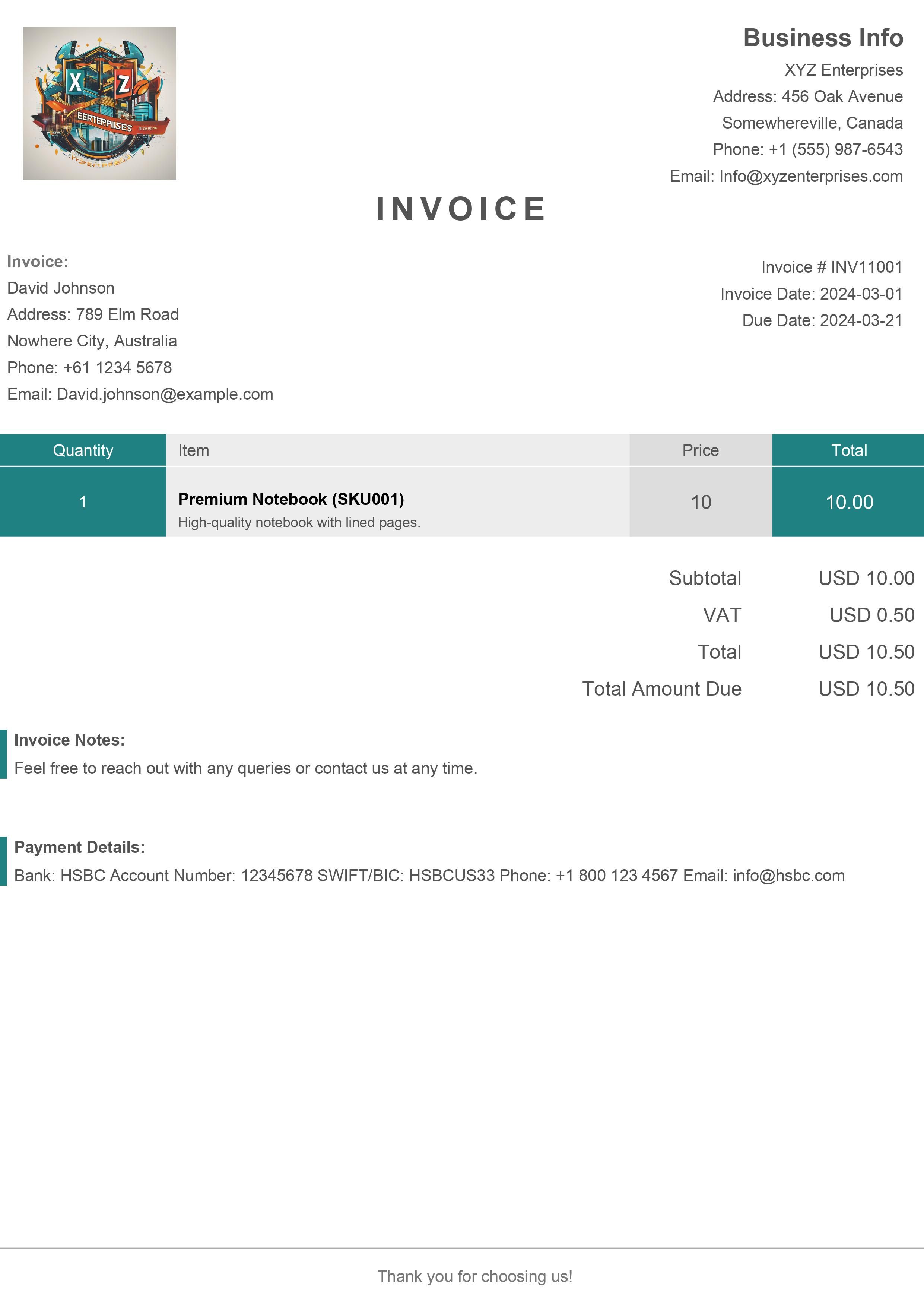 - Invoicing: Create and manage invoices with unique IDs and transaction numbers.