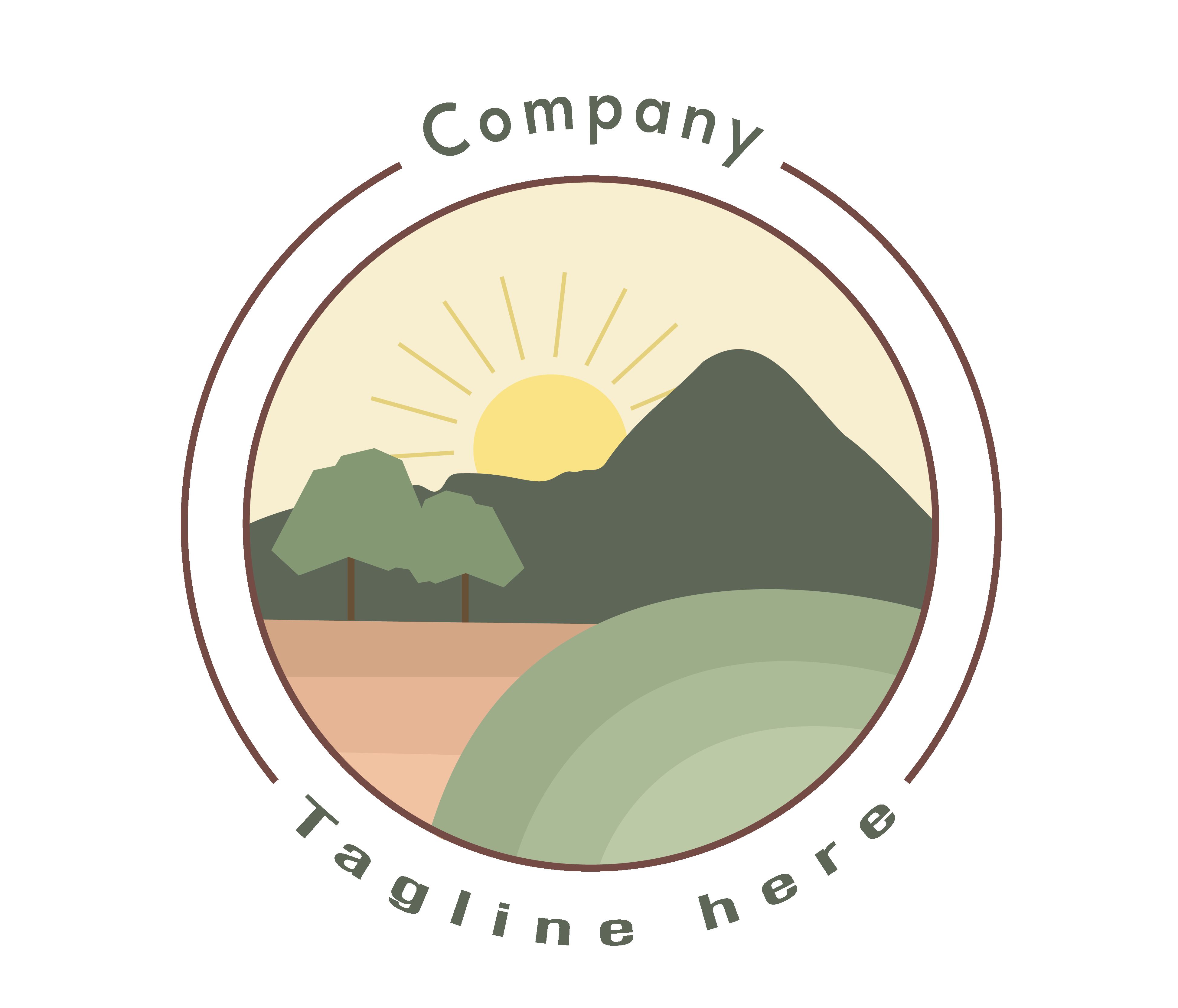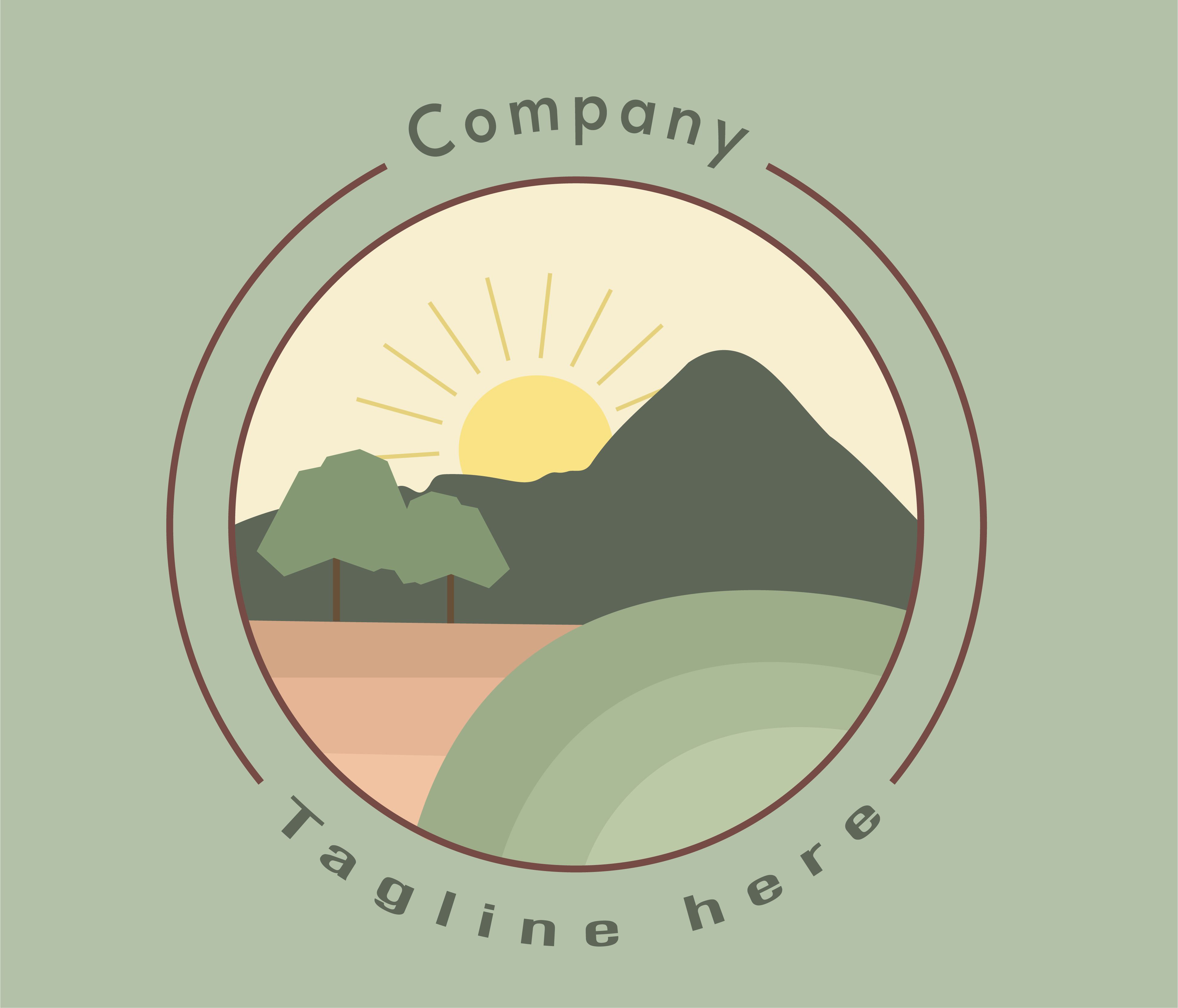 The logo depicts a hill at sunset, with trees, roads and crops in soft tones. The colors are past...