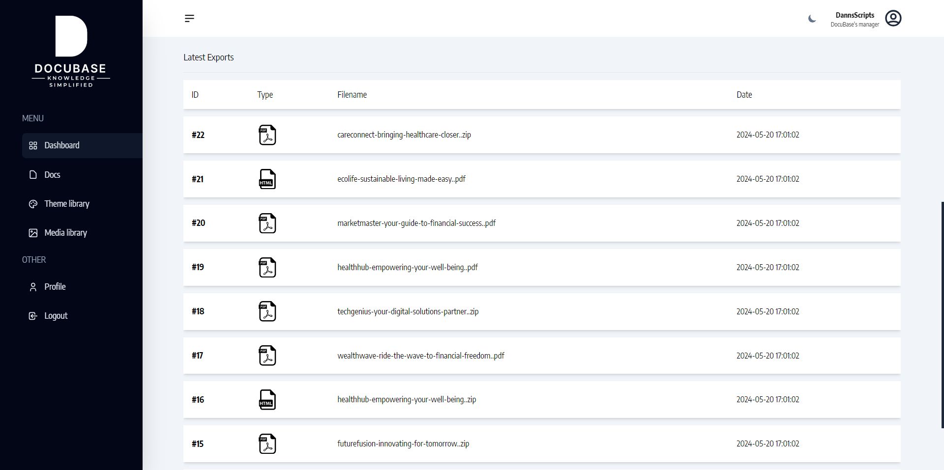 DocuBase is a streamlined web application designed for managing documents, e-books, and knowledge bases with efficiency and ease. This versatile tool offers a wide set of features to create, maintain, manage, and export HTML/PDF documents, including all forms of documentation, e-books, and knowledge bases.