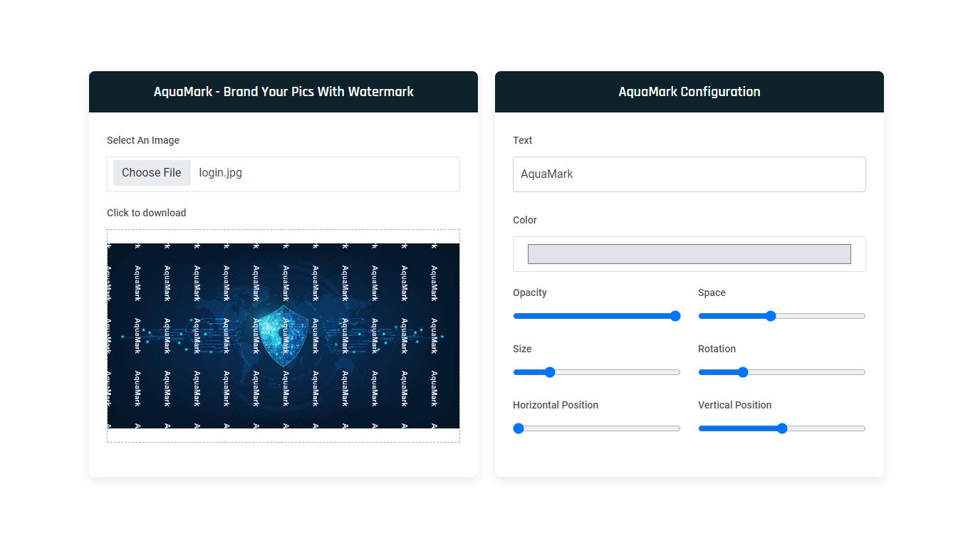 The tool also allows for rotation and spacing adjustments, ensuring your watermark blends seamlessly with your image. AquaMark's clean, responsive design, built with Bootstrap, guarantees compatibility across all devices, providing a smooth user experience.