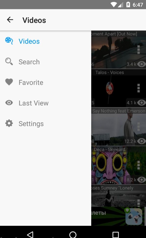 - Available sections : videos, search, favorite, last viewed videos, settings.