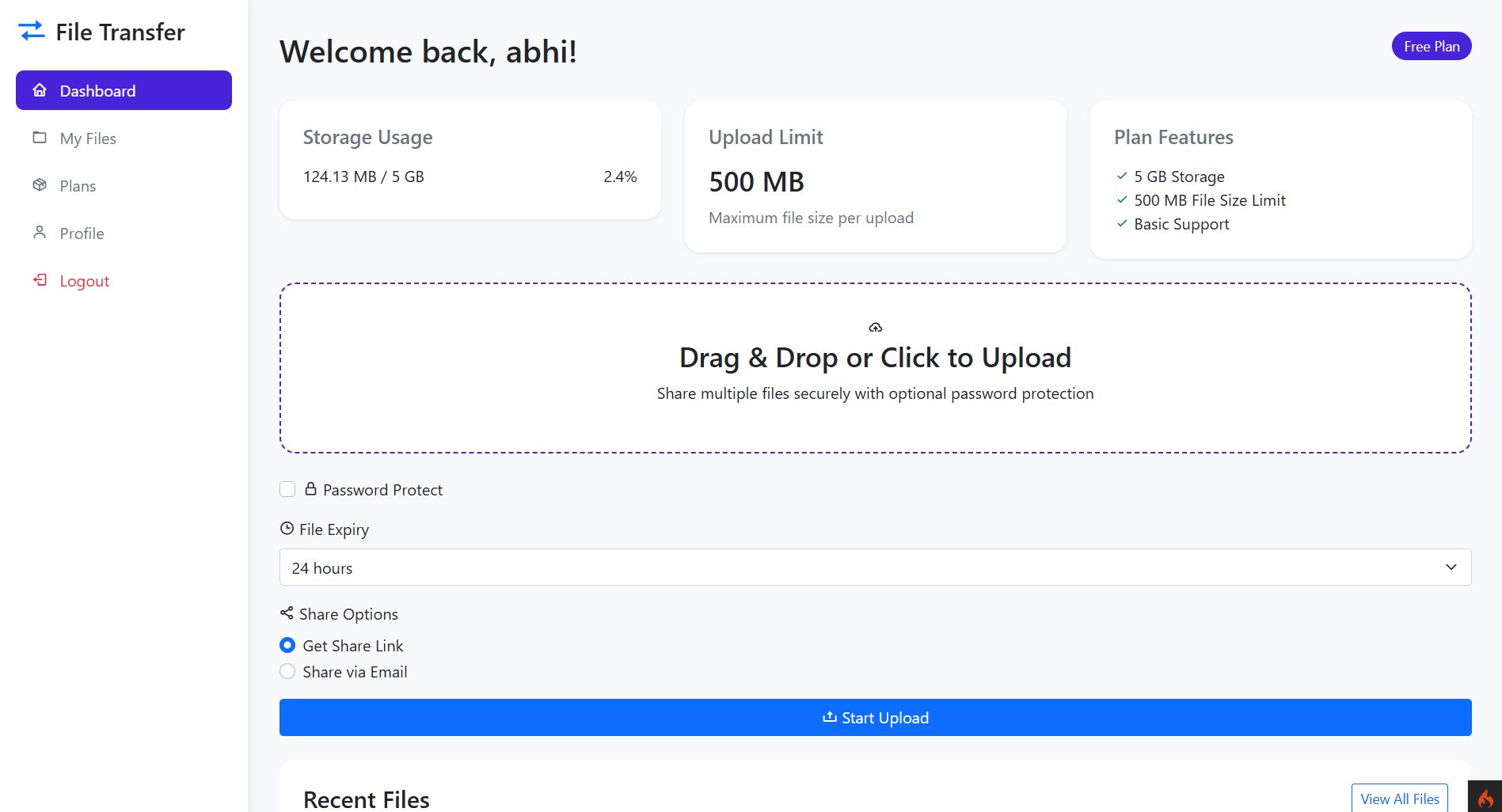 An efficient, secure platform for sharing files globally. This system enables users to send files seamlessly via email or direct link, with robust privacy and security measures. Flexible subscription plans are available with integrated payment options, supporting both PayPal and Razorpay for convenient transactions.