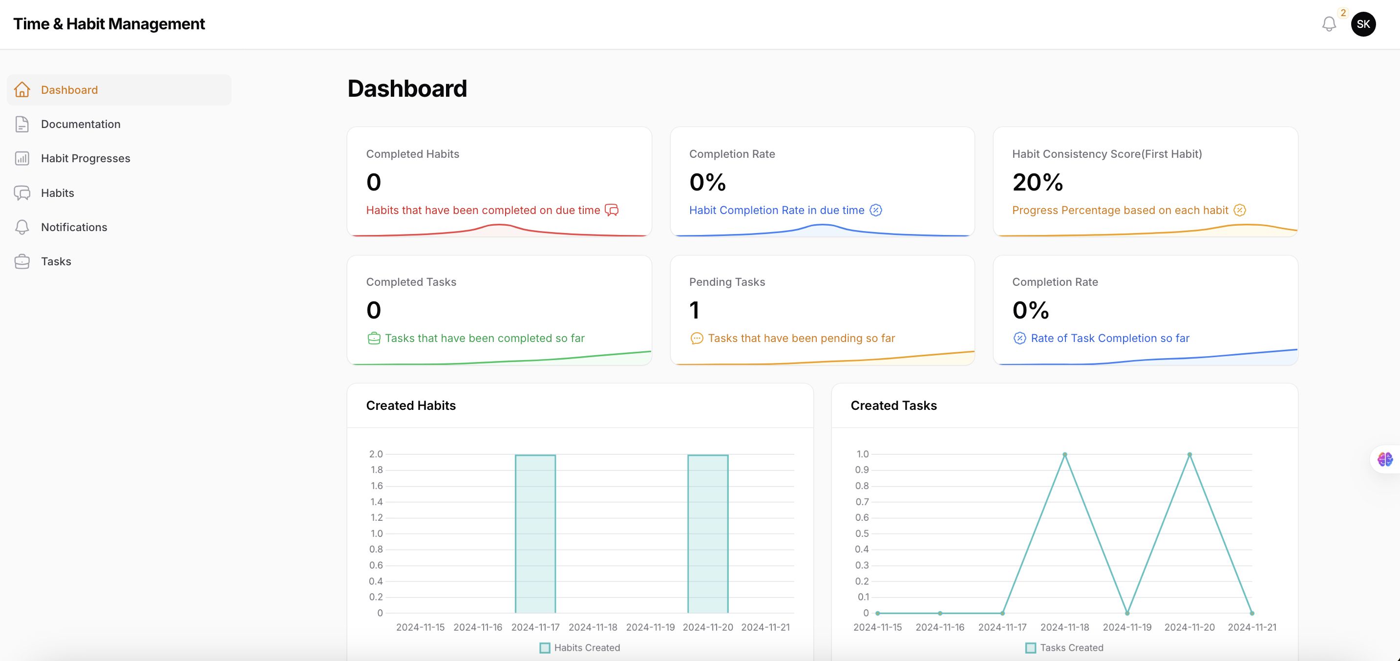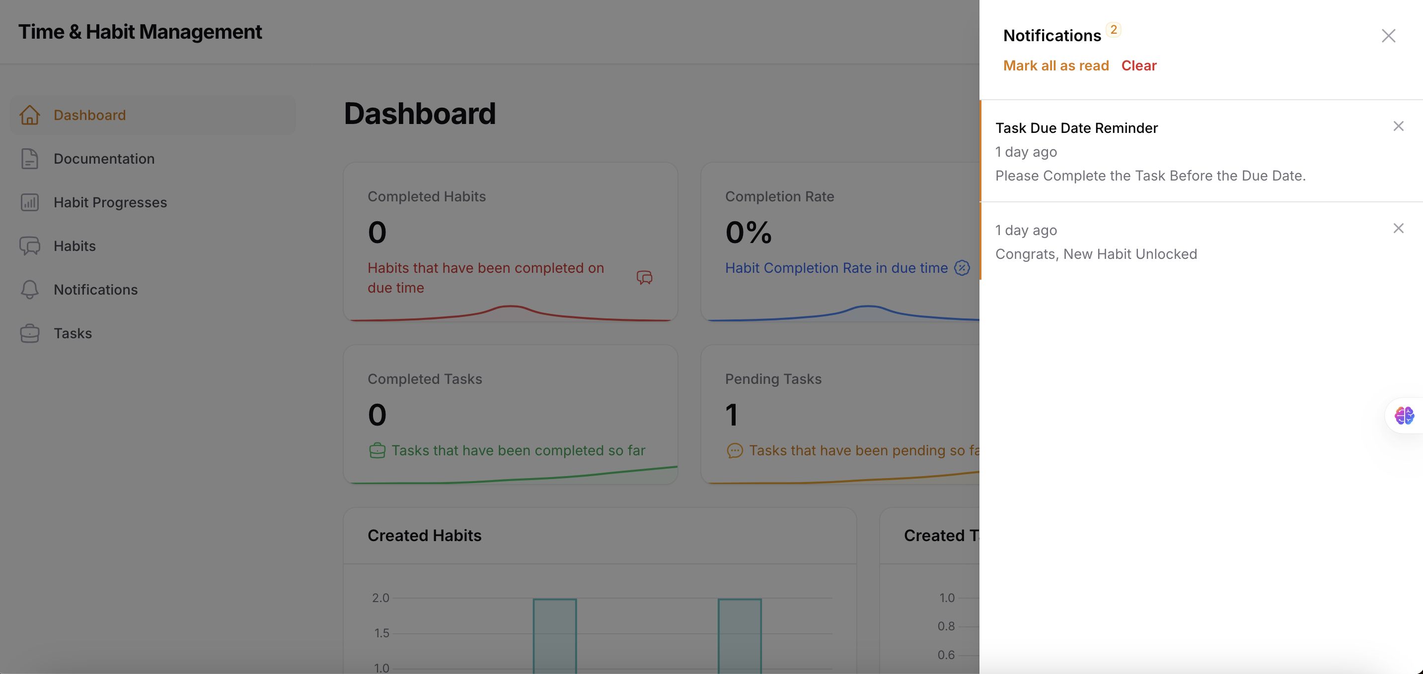 - Analytics: Statistics and Chart Analytics for created tasks, habits, progress percentages etc.
