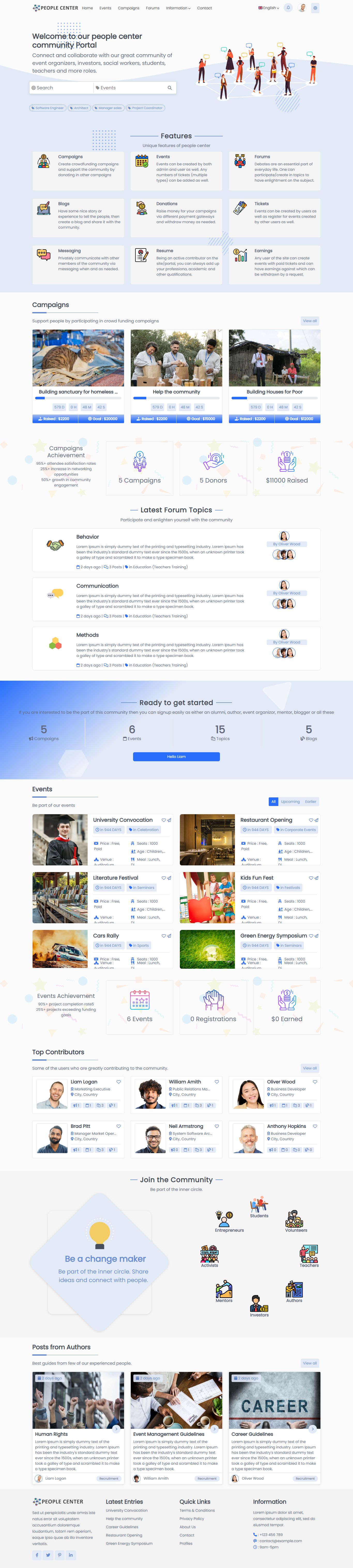 People center is a user collaboration platform which can be used by any organization or group of people where members can create and participate on content whether it be an event, a crowdfunding campaign, a forum topic or a blog. Admin can also create these entities from admin panel and disable the capability for user to create. The script can be used as an events directory and registration site, a crowdfunding campaigns platform, an alumni network, a guest author blogging platform or a combination of all. There are some unique features including popular payment gateways, user chat/messaging system, payment withdrawals for event sales and campaign donations, multi language with RTL support, site CMS management and more.