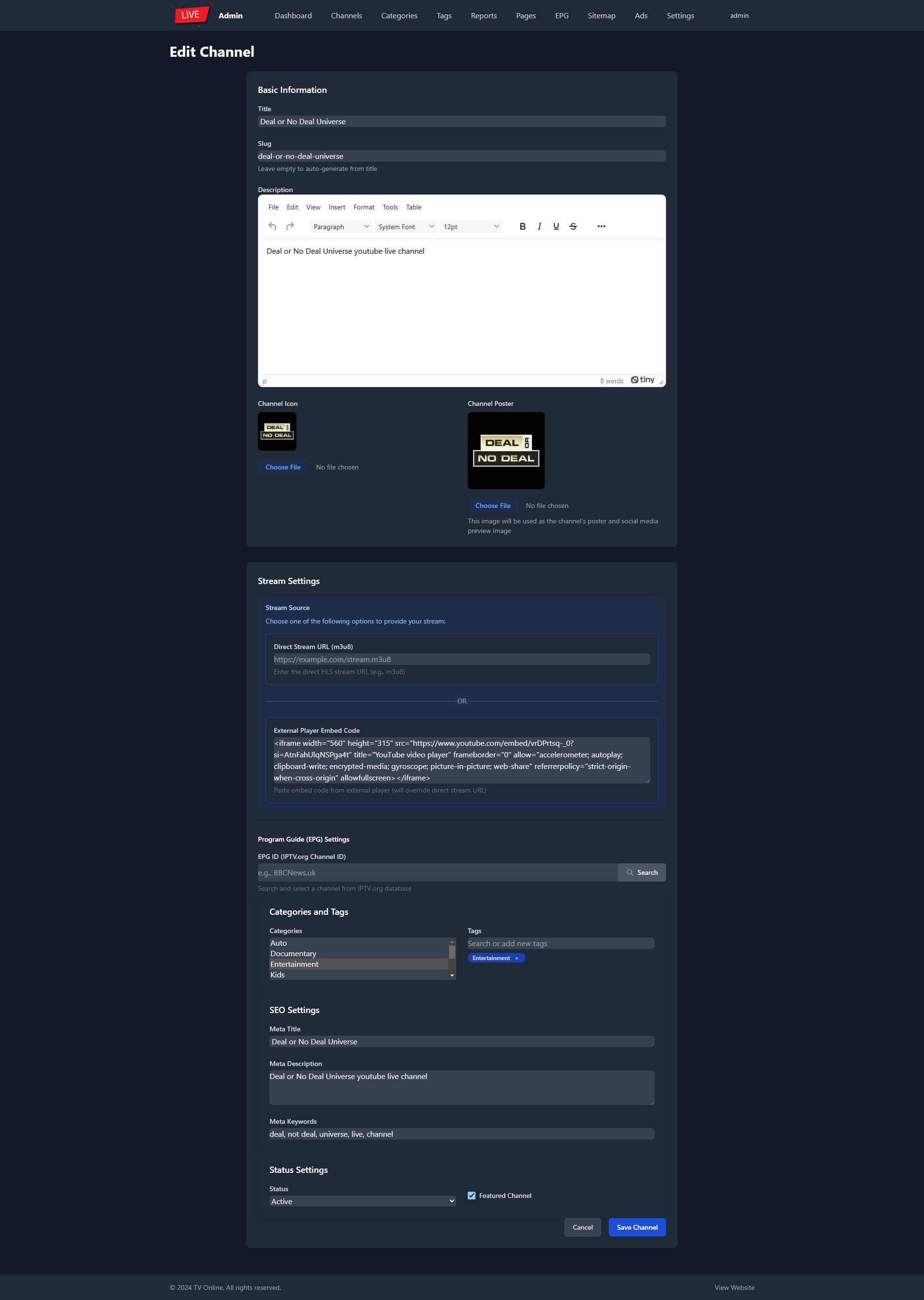 TV channel management platform for creating and managing your own streaming service. Complete with EPG guide and admin dashboard.