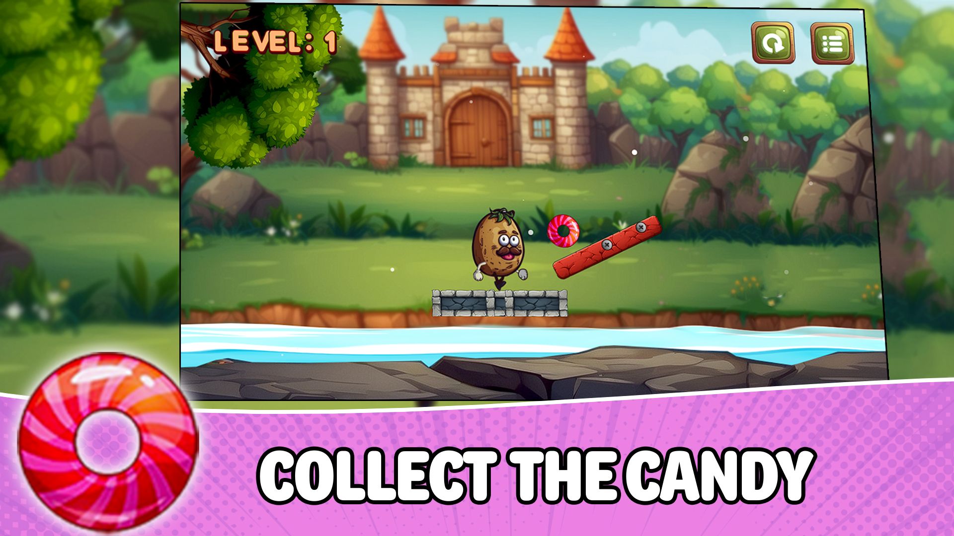A potato man in the game want to eat the sugar candy, but the candy put in a tricky place. Player has to solve the trick and help the potato man to get that sugar candy. Be wise and take the candy as fallen down of this candy will over the game.