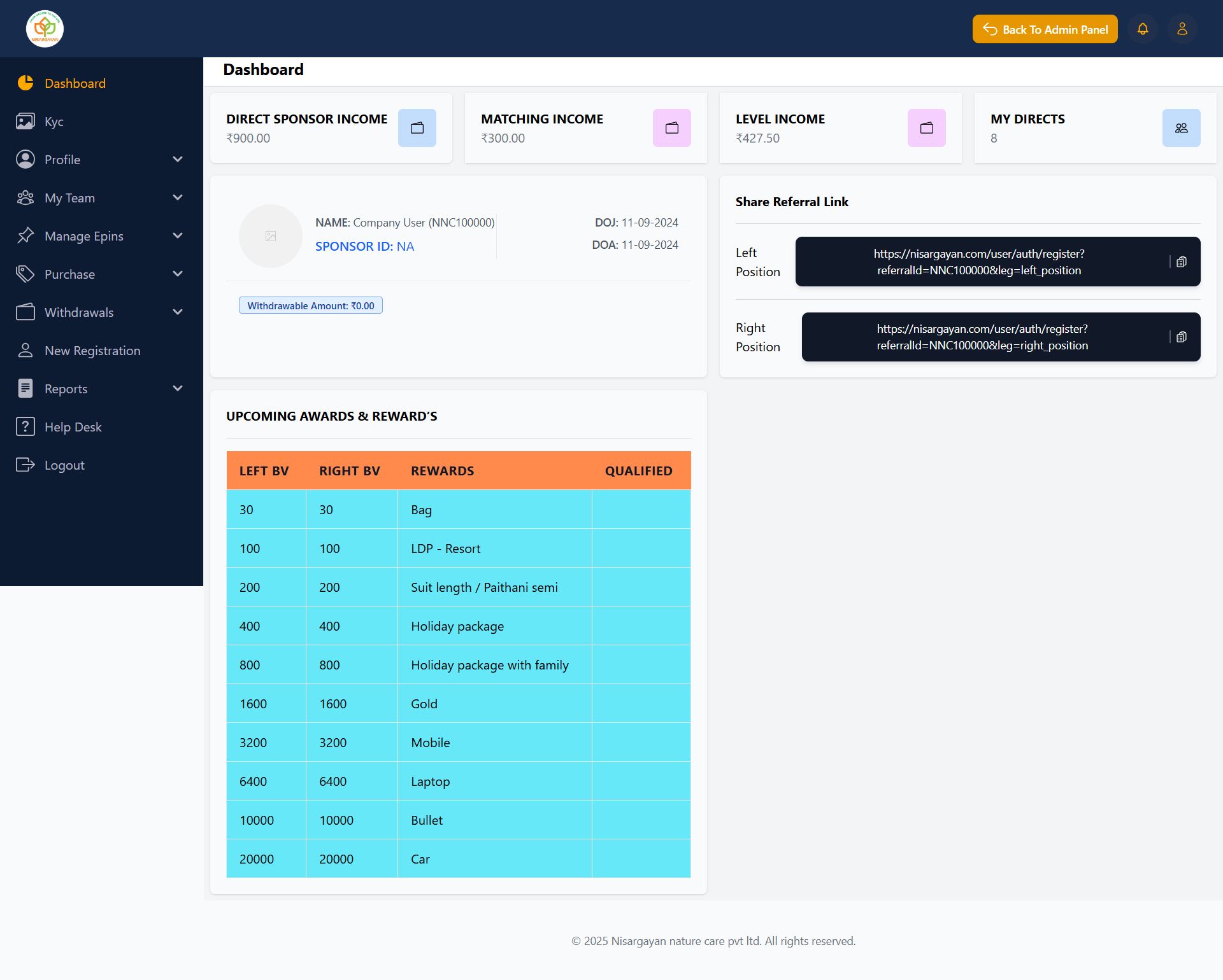 - EPIN Management – Track used, unused, approved, and pending EPINs for user activation.
