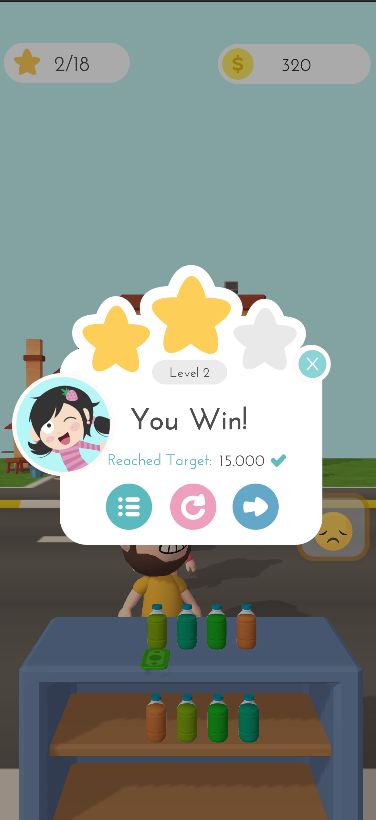Clean UI, animated transitions, vibrant color palette, and elegant bottle graphics perfect for casual gamers.