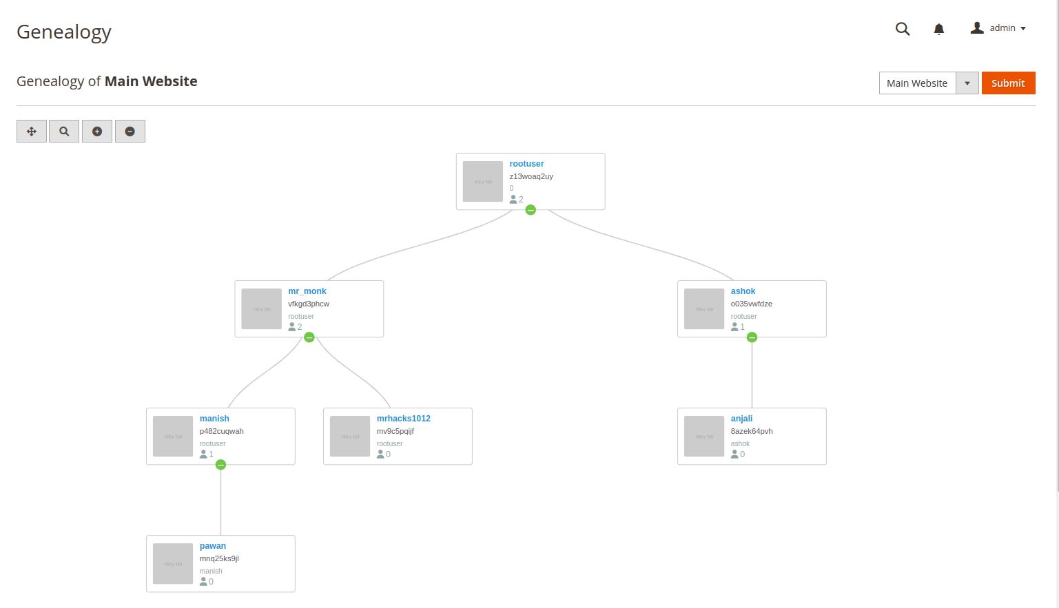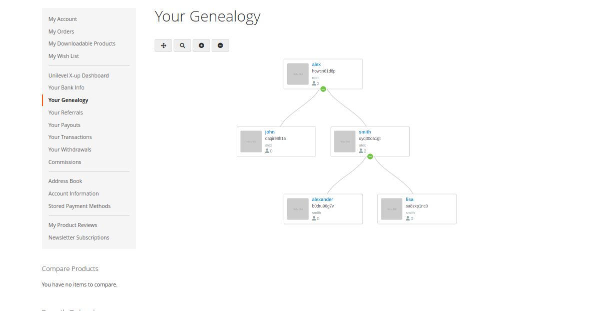 - Live income reports, genealogy tree, product purchases, ticket system.