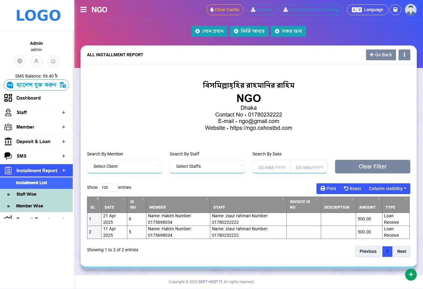 This modern NGO Management System is designed specifically for NGOs and microfinance institutions to efficiently manage staff, members, deposits, loans, installments, financial reports, and SMS notifications — all from one centralized platform.