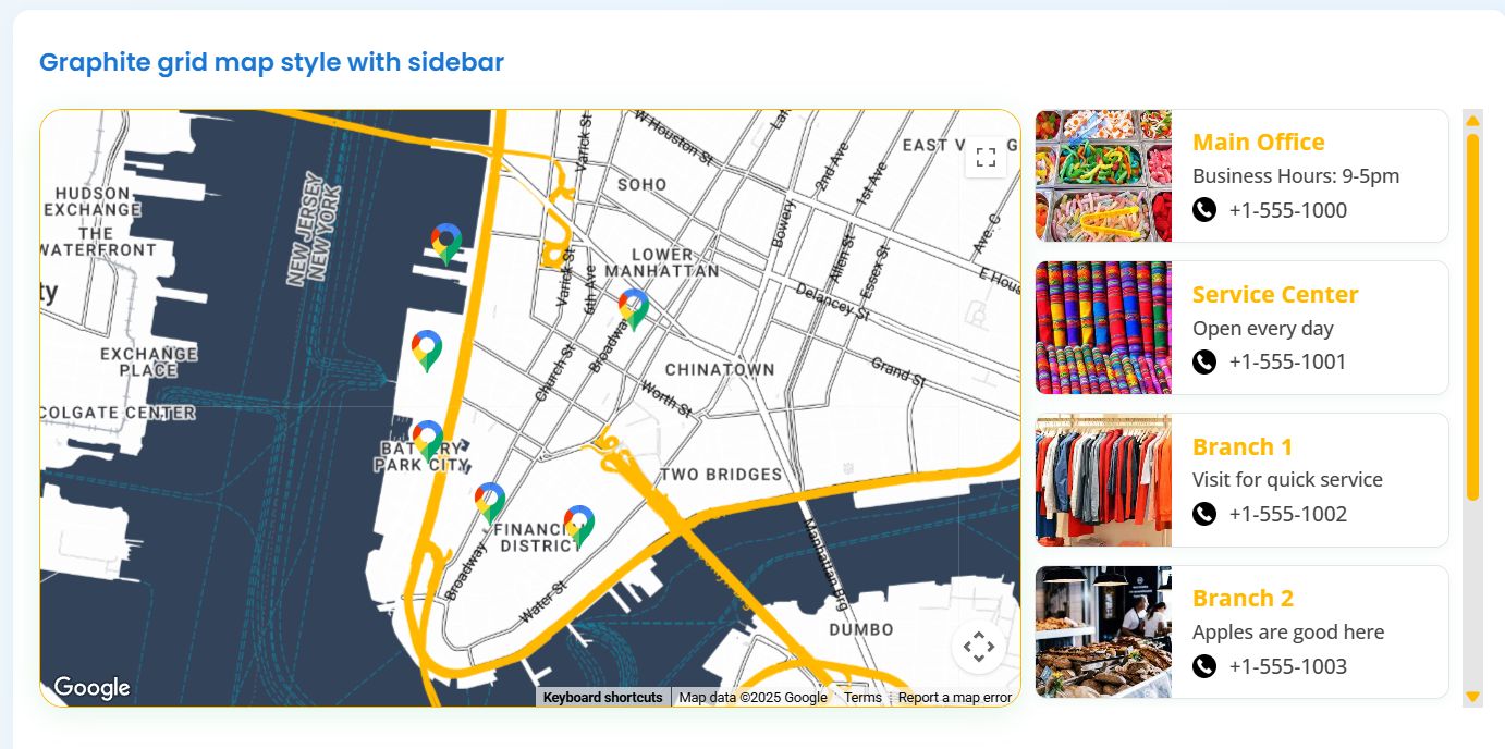 - Custom business name, phone number, and rich details, custom pin icon for each pin