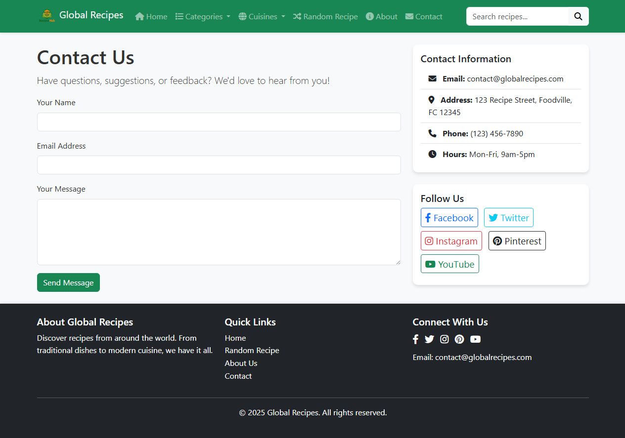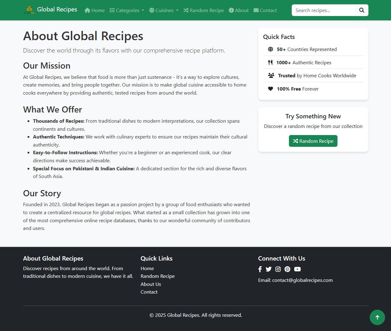 RecipeHub is a user-friendly, responsive recipe sharing platform that integrates seamlessly with TheMealDB API for international recipes and a dedicated CSV API for Pakistani/Indian dishes. Designed with Bootstrap 5, it ensures smooth performance across all devices. Key features include category and cuisine filtering, a random recipe generator, YouTube video integration, and detailed recipe pages. The platform supports ad management and social sharing, all configurable via a simple config.php file. No database is required—just upload the files to your server and you're ready to go!