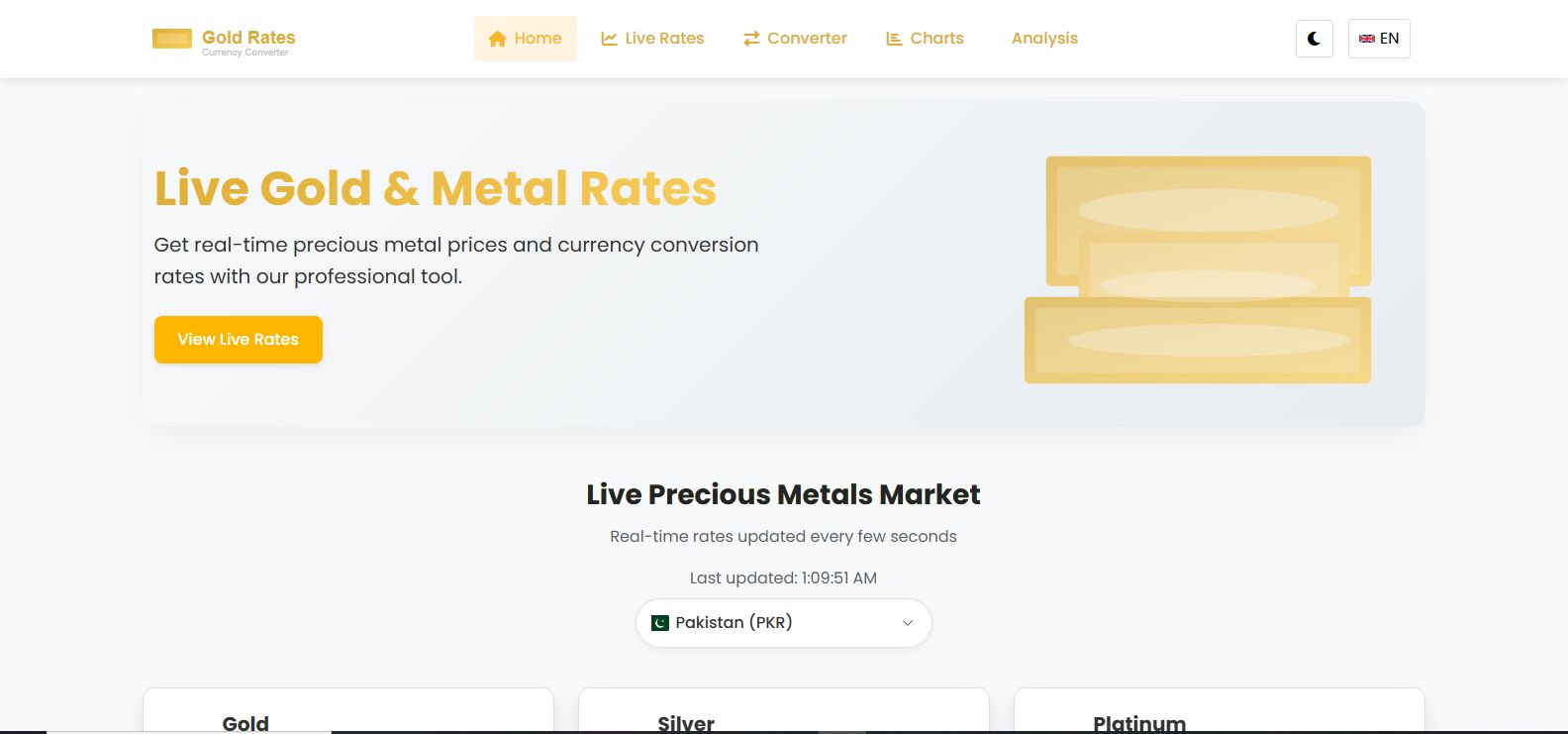 Track live gold, silver & platinum rates with currency converter. Includes real-time updates, dark/light mode & responsiveGold Rates And Currency Converter