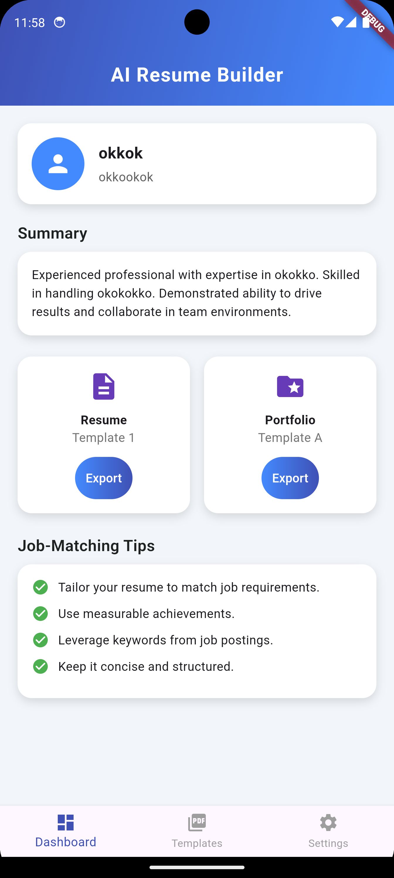 . - Navigate through the UI to test features like login, resume creation, preview, and export.