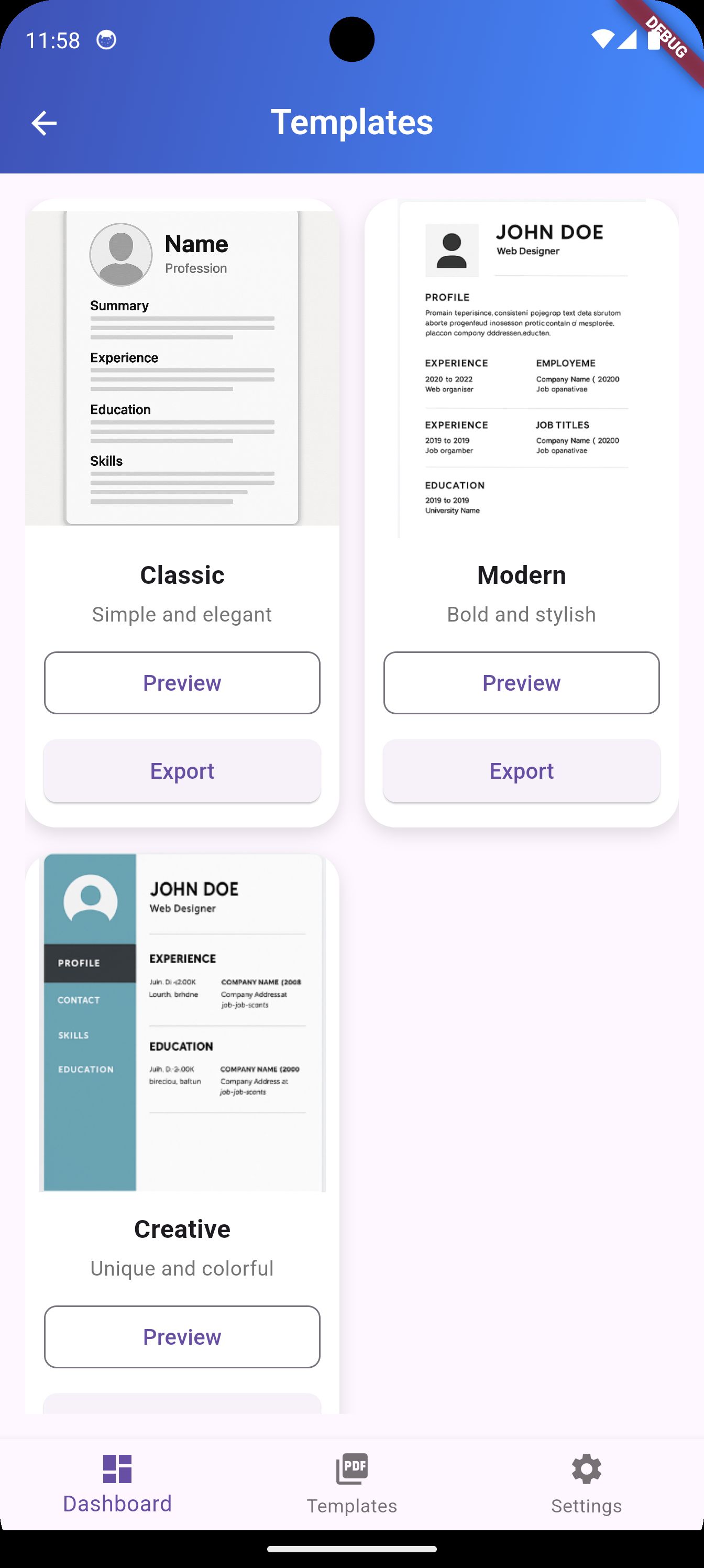 A modern and sleek Resume Builder app UI built with Flutter. Fully responsive design with multi-section resume templates, preview
