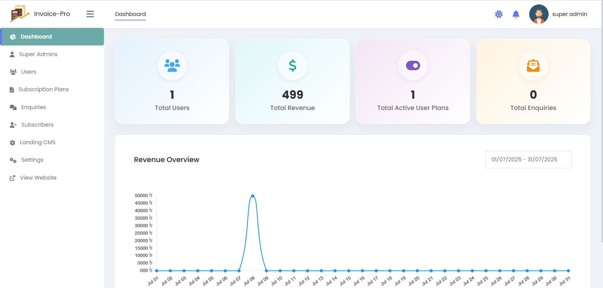 - Dashboard Overview Track total tenants, transactions, active subscriptions, system-wide revenue, and plan usage.