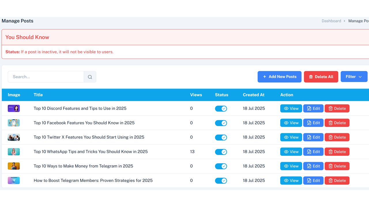- 📱 Add/Edit/Delete groups, blog posts: Full control over content management.