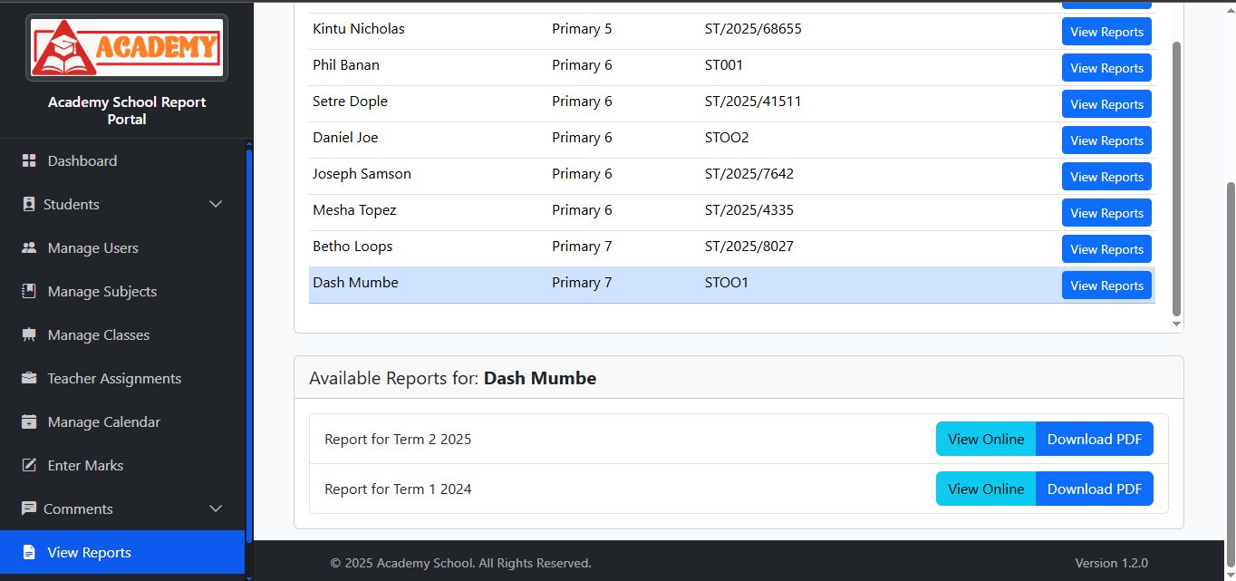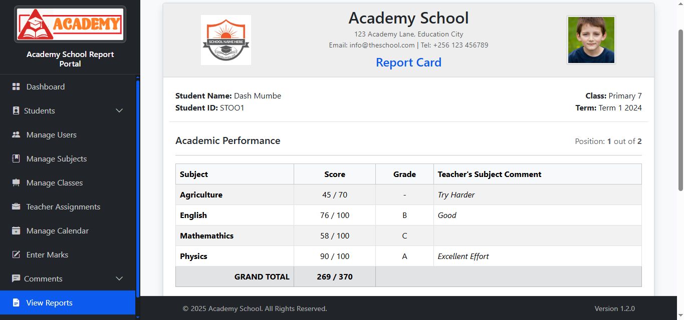 Tags | school, student management, teacher dashboard, parent portal, report card, php report system, marks entry, headmaster admin, role-based php, school web app |