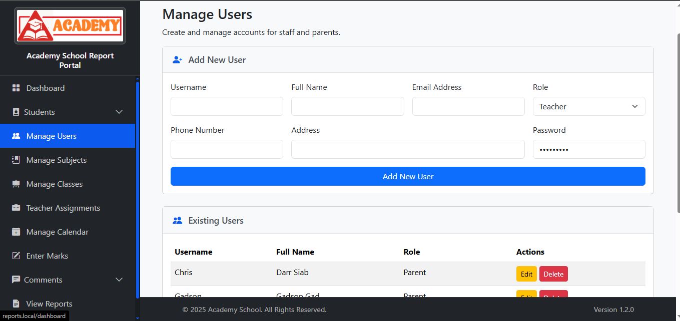Access the app via browser and log in using demo credentialsBegin by adding users, classes, and subjects[Read full instructions in the documentation folder]