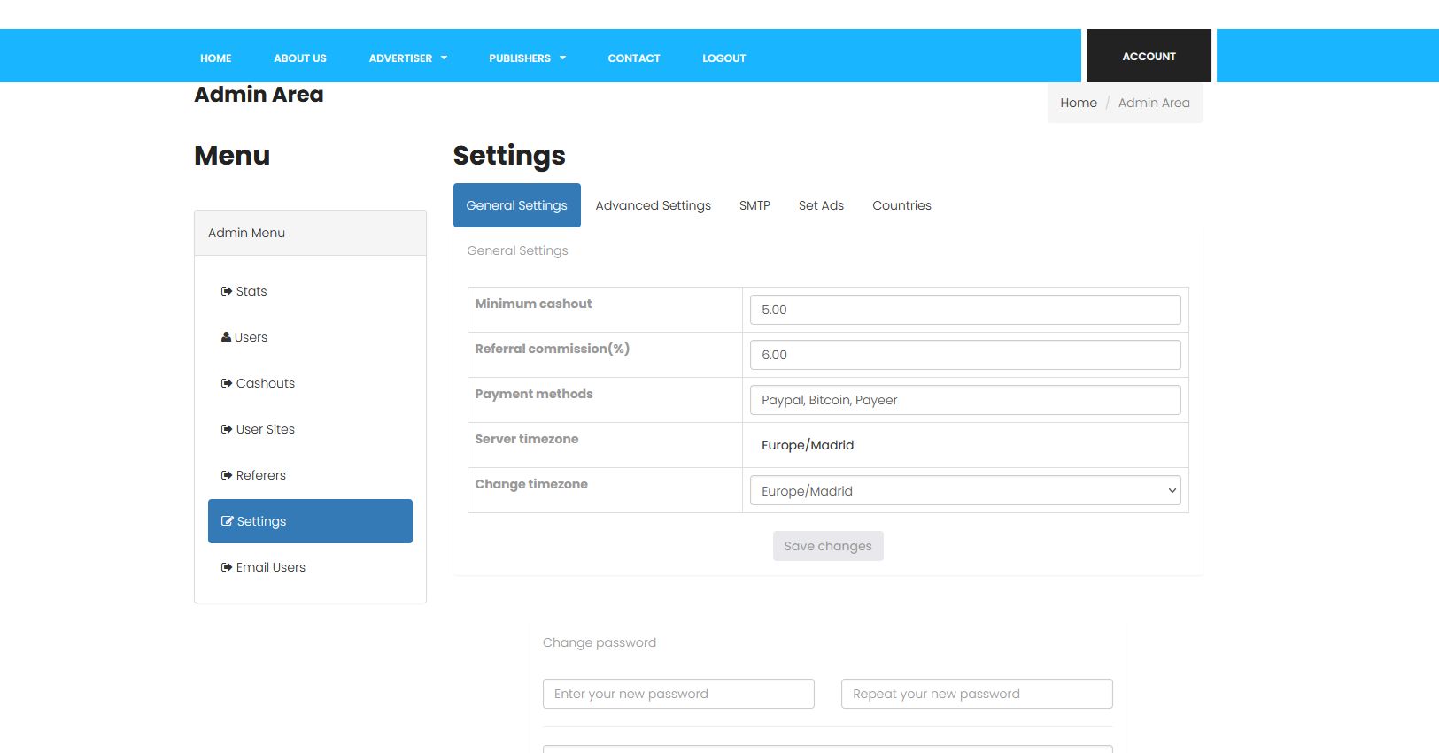 Manage users, sites, cashouts, settings, SMTP, countries, tiers.