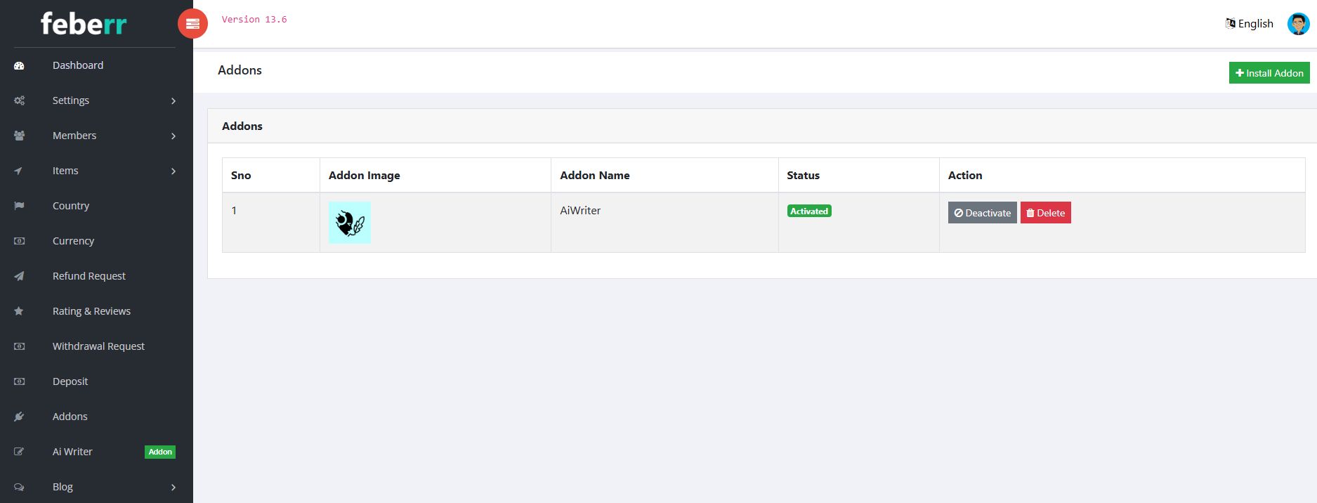 - Download and install this AiWriter Addon to your Feberr admin panel.