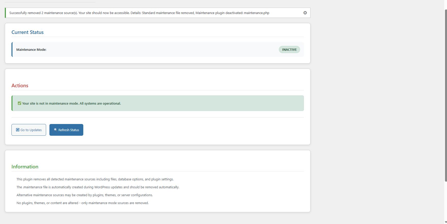 | Tags | wordpress maintenance recovery, emergency recovery plugin, maintenance mode stuck, wordpress admin access, one-click recovery, maintenance file removal, htaccess cleanup, wordpress emergency tools, site recovery plugin, admin dashboard access |