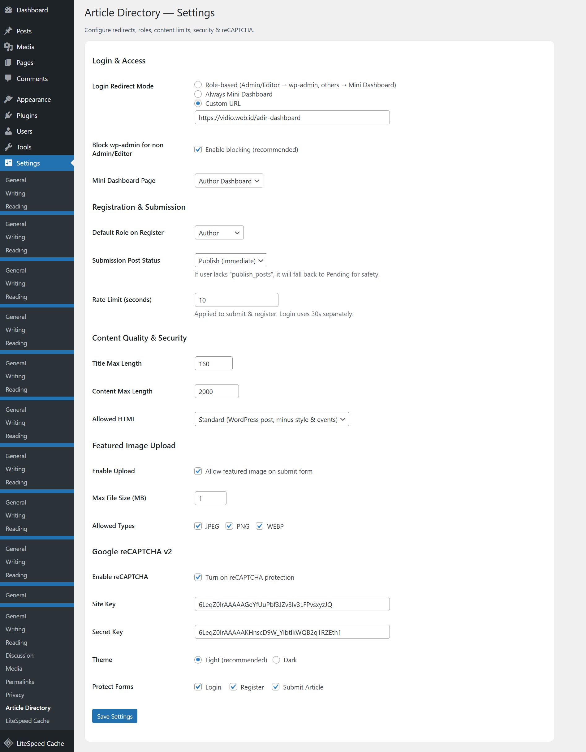 - Settings: login redirect policy, submission status (pending/draft/publish), rate limit, allowed HTML mode, upload policy, and reCAPTCHA v2 (light/dark)
