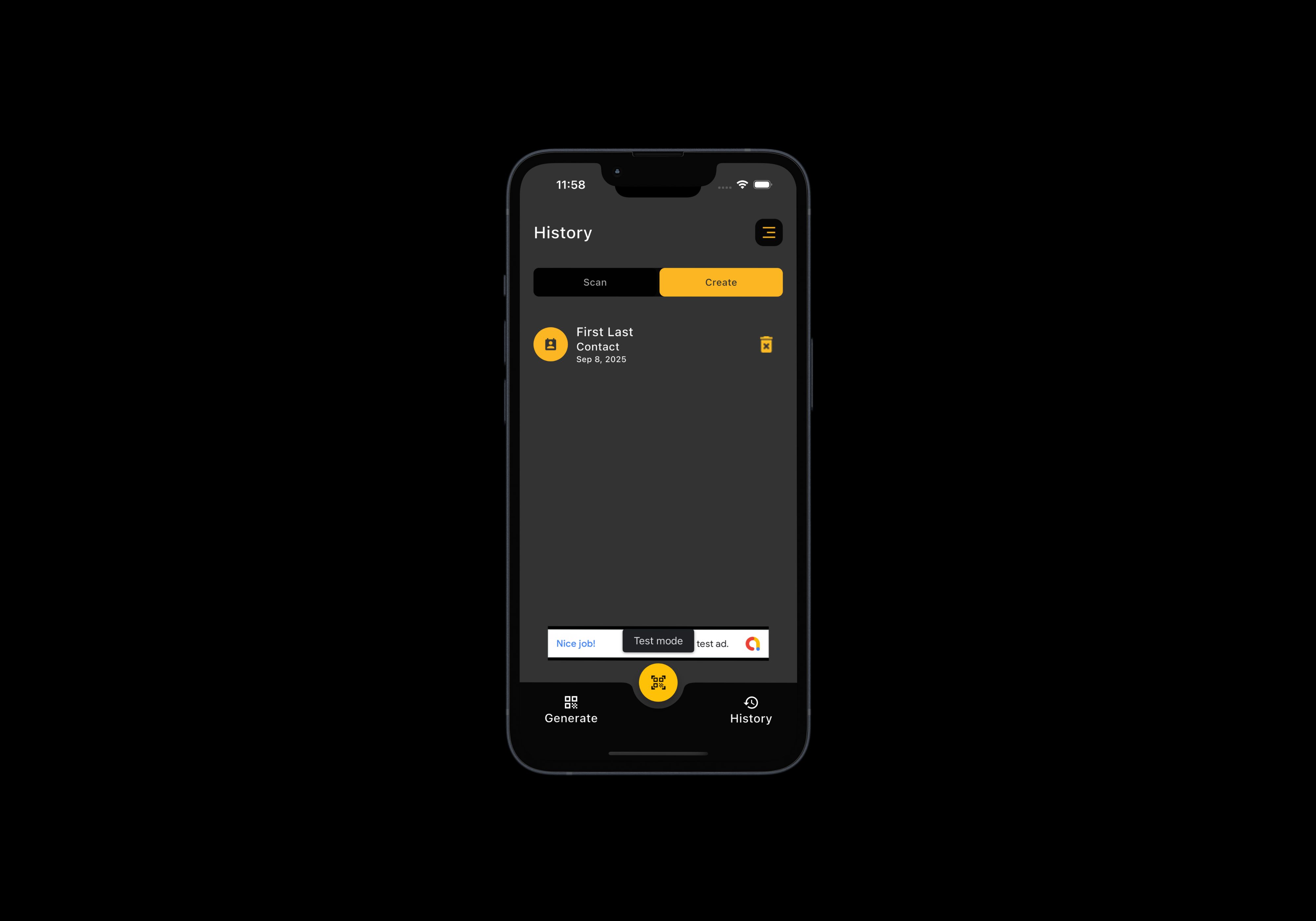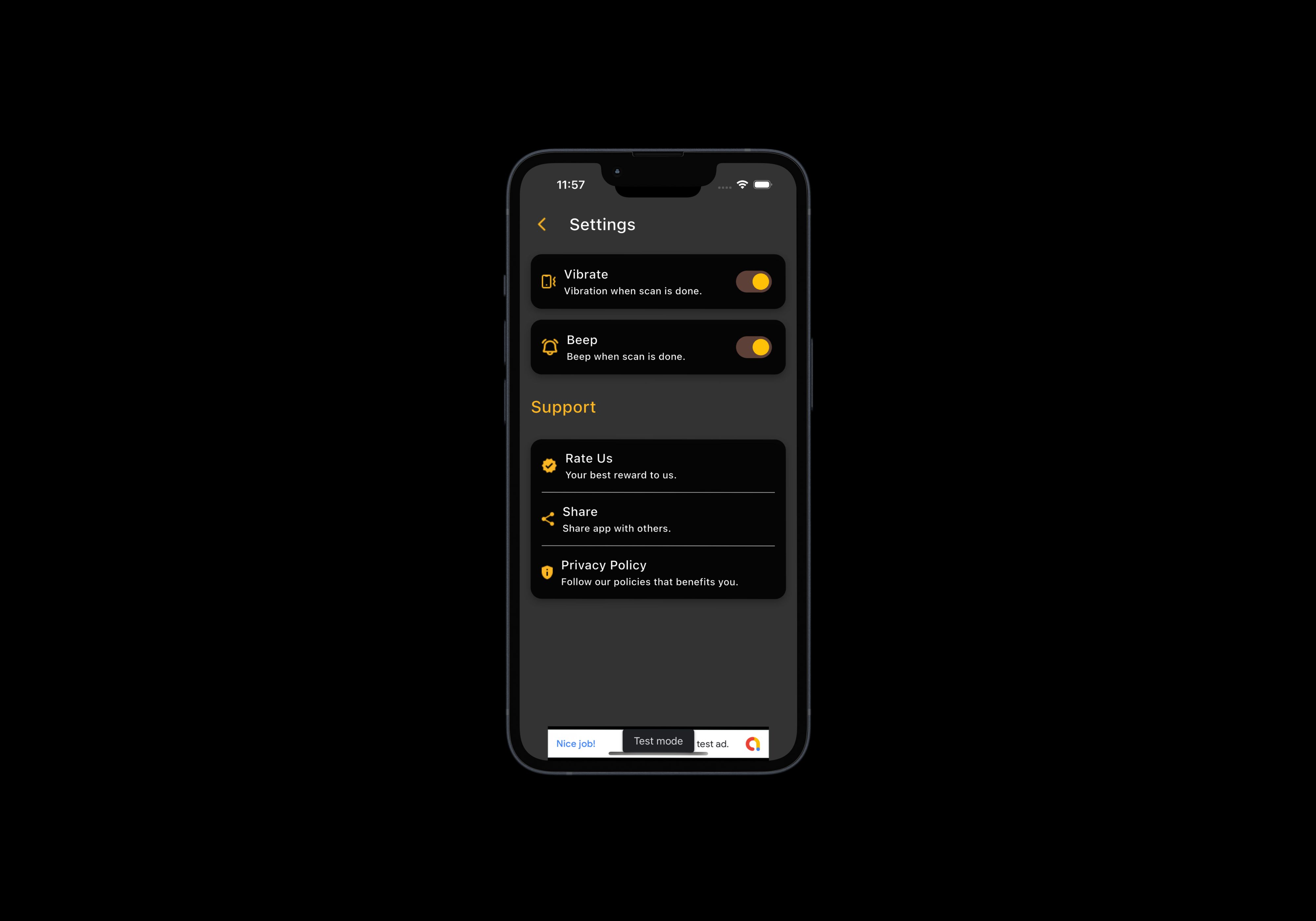 Built with Flutter (Android & iOS support)Scan QR codes & multiple barcode formatsScan from camera or gallerySave contact details directly to phonebookConnect to WiFi networks from QR codesAdd events to calendar (ICS/Calendar QR support)Open URLs in browserSend email or SMS from QR contentSave scan history locallyFlashlight toggle for low-light scanningCopy & share scan resultsClean, modern UI designBeep sound & vibrate option control over the settings