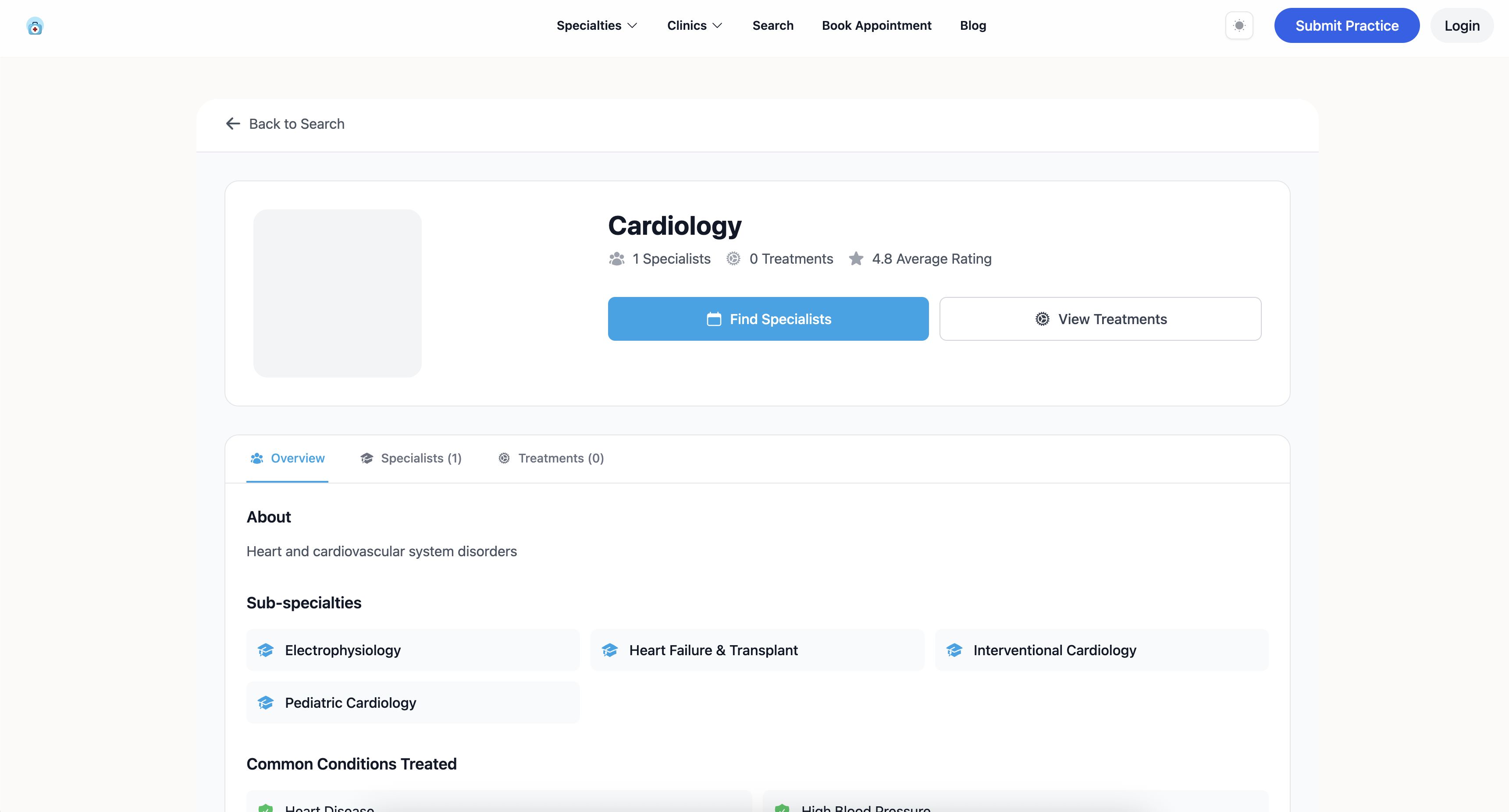 - Healthcare Discovery: Advanced search and filtering system for doctors by specialty, location, language, treatments, and availability.
